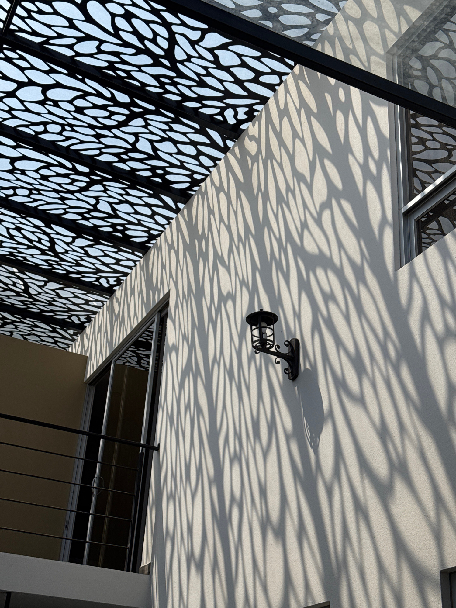 The image shows an interior ceiling in San Bernardino Tlaxcalancingo, Mexico, illuminated by patterned sunlight filtering through a lattice-like screen. A black, ornate wall sconce is mounted on the c…read more