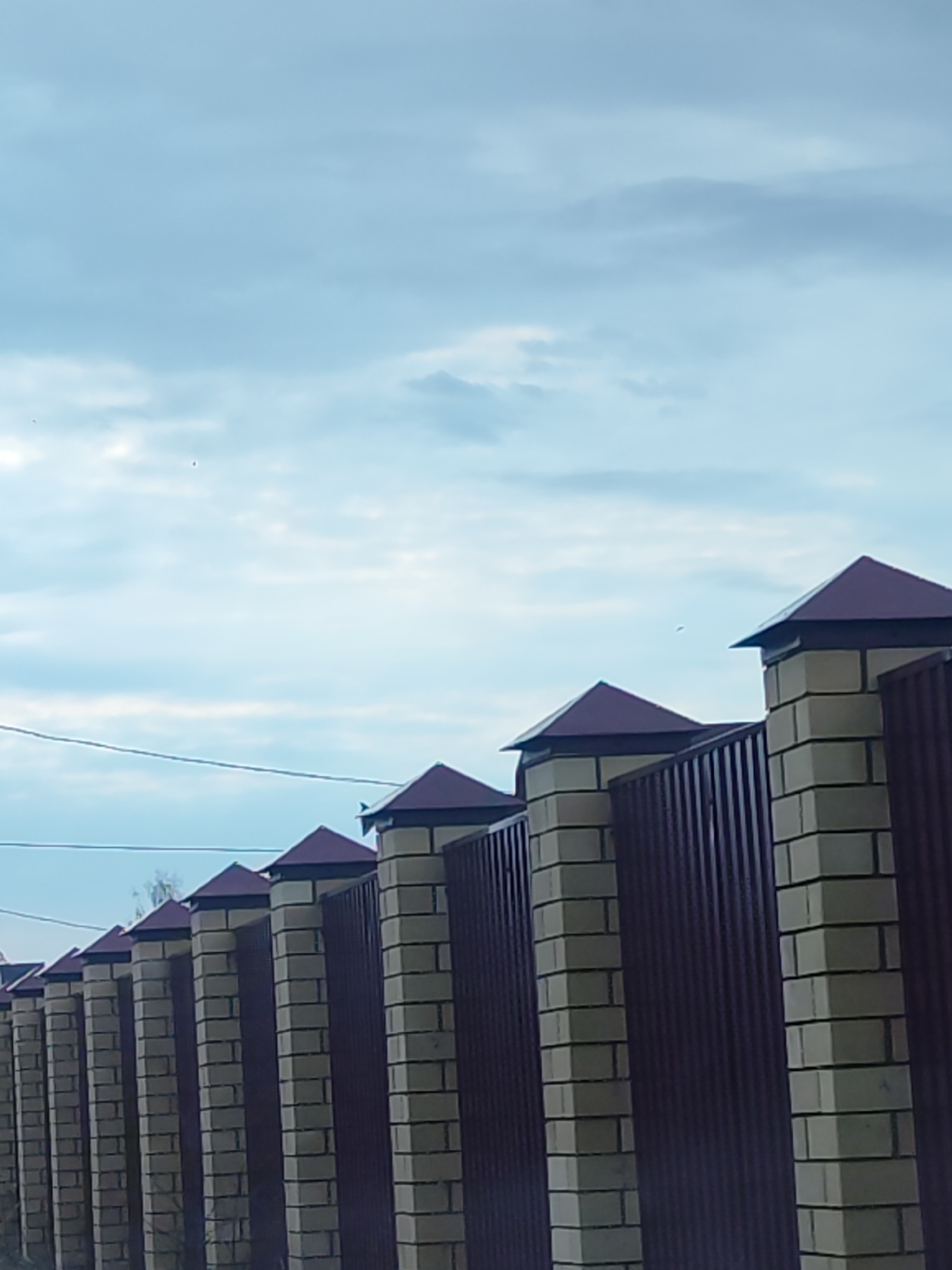 The image shows a long fence with brick pillars and burgundy metal panels in Chaikovsky, Russia. The pillars are capped with dark pyramidal tops. An overhead electrical wire runs parallel to the fence…read more