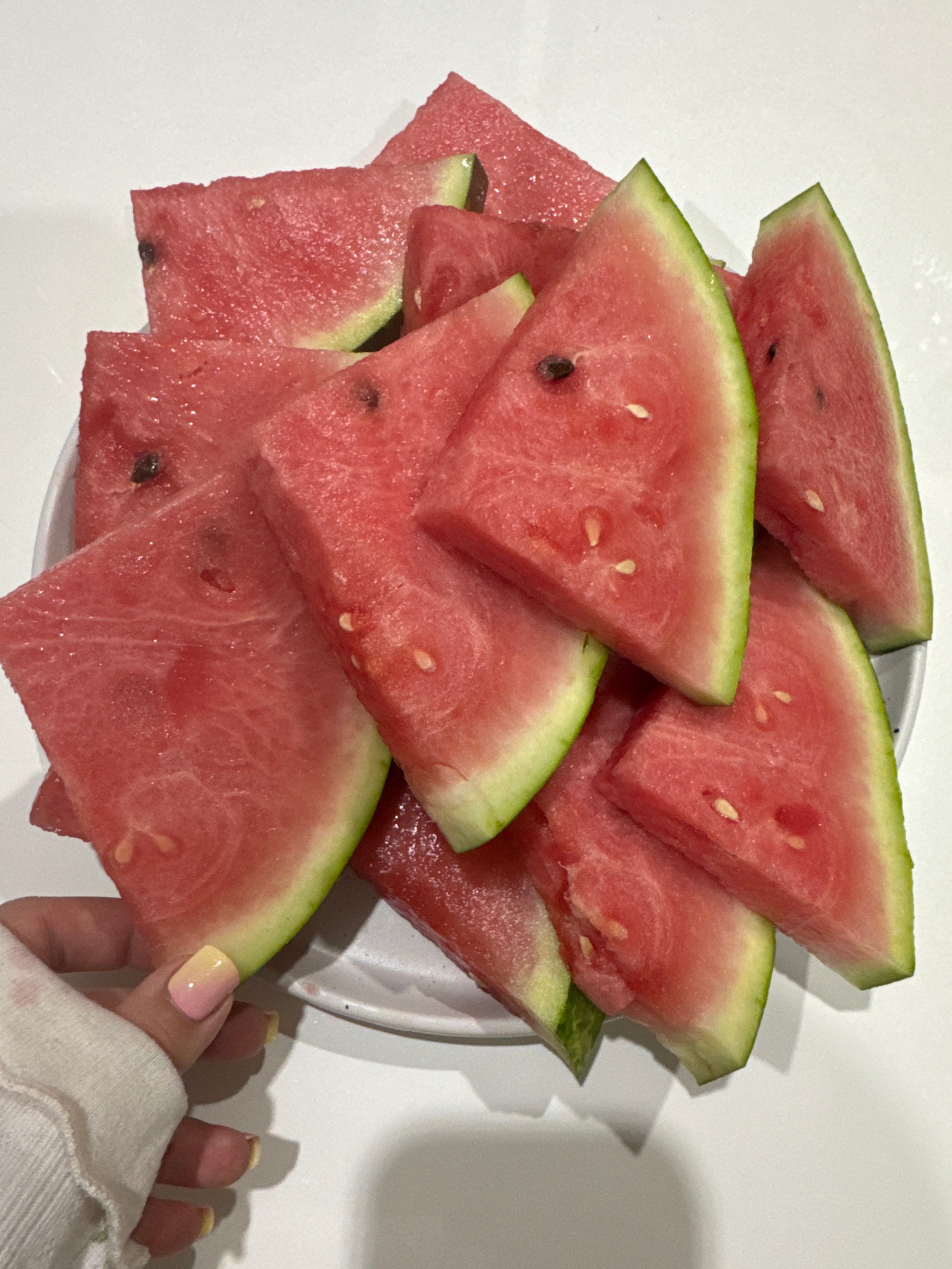 A top-down view shows a plate of watermelon slices on a white surface, with a hand holding one of the slices. The watermelon slices are mostly triangular in shape, with pink flesh and green rinds. A f…read more