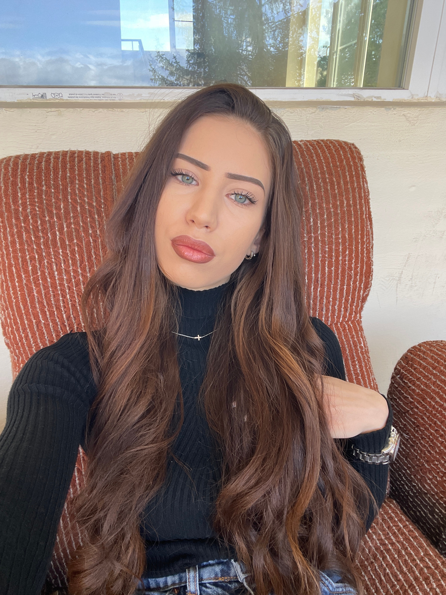 The image is a medium-shot photograph of a young woman with long, brown hair and light-colored eyes. She is reclining on a brown and orange striped fabric surface, likely a sofa or cushions. She wears…read more