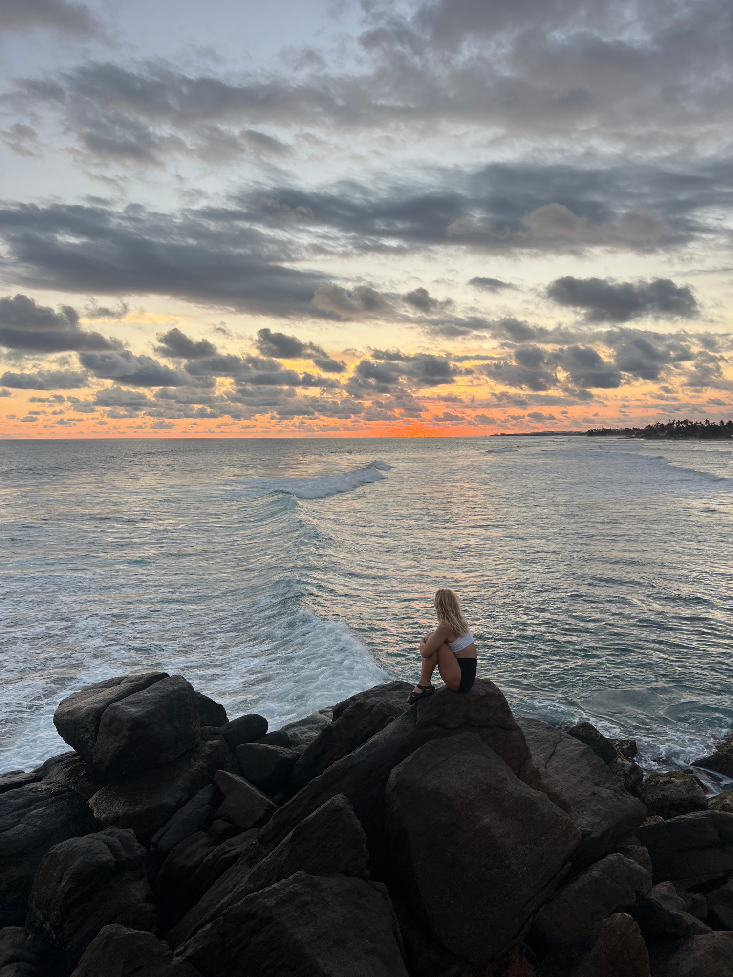 A vertical shot depicts a woman perched on a rocky outcrop overlooking the ocean in Ahangama, Sri Lanka. The sky is filled with clouds, transitioning from gray to a vivid orange near the horizon. Theβ¦read more