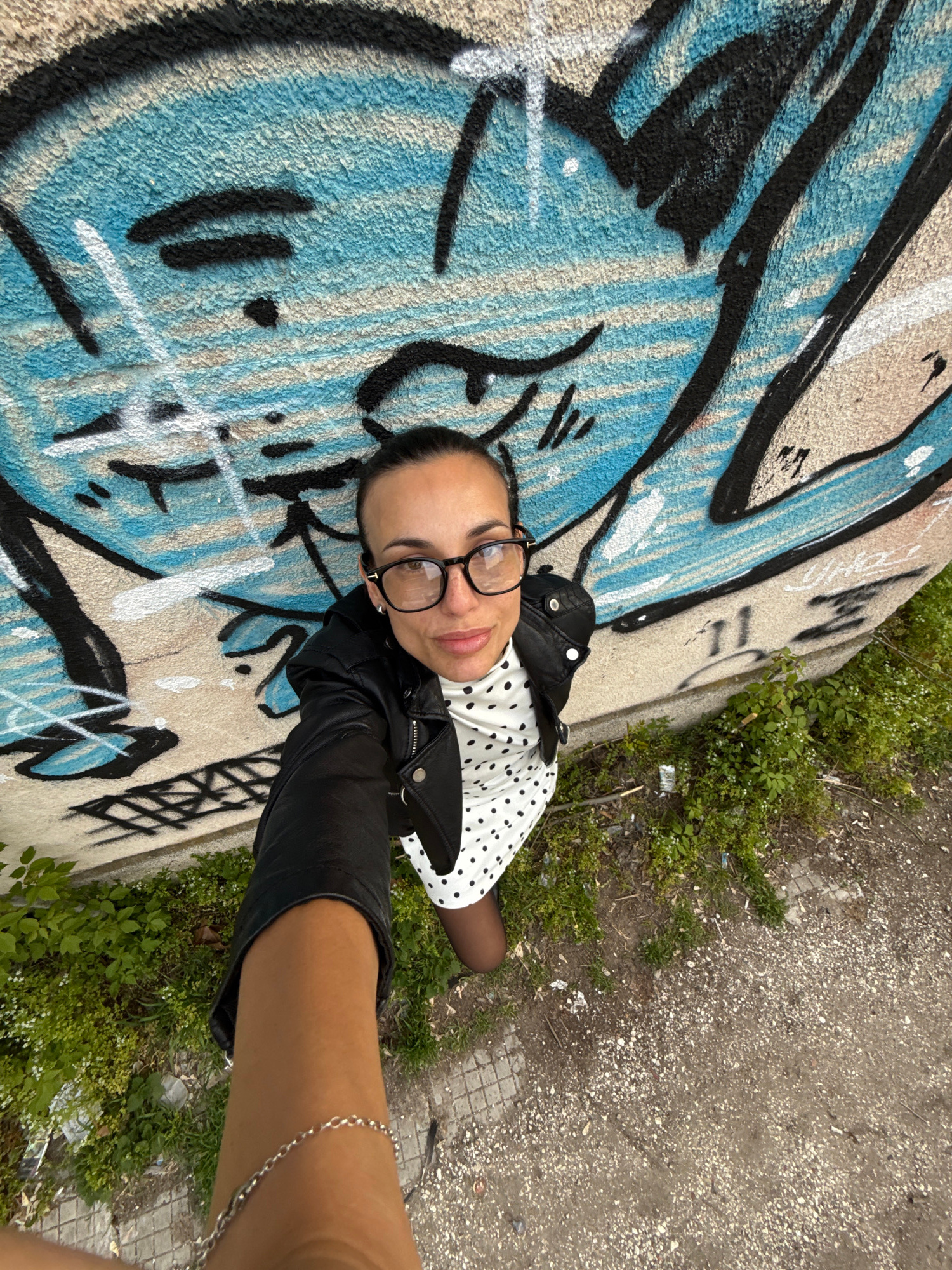 A woman in a black leather jacket and white polka-dot dress lies on a concrete surface covered in blue and black graffiti. She wears glasses and faces the camera, holding up her arm as if taking a sel…read more