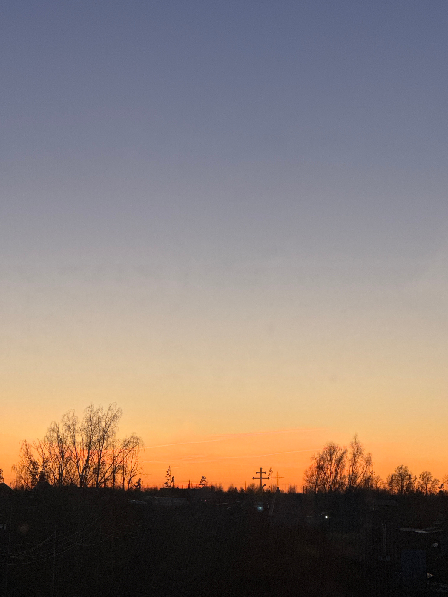 The image shows a sky at sunset. The left side of the image is a pale blue, transitioning to a yellowish-orange on the right. In the foreground on the right side are silhouettes of trees and possibly…read more