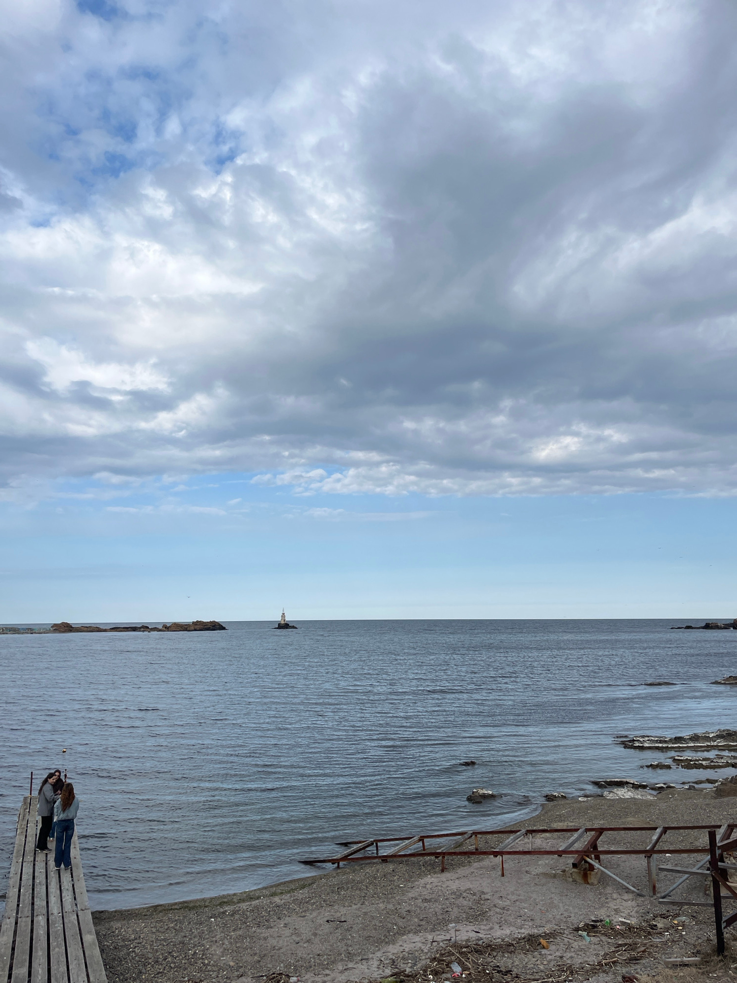 The image depicts a seascape in Ahtopol, Bulgaria, with the horizon oriented vertically. The left half of the image shows a cloudy sky with patches of blue. The right half features the sea, a coastline with visible rocks, and a small lighthouse in the distance. Along the bottom edge, a wooden pier extends into the water, where two individuals are present. A metallic structure runs along the shore above. Debris and trash are scattered along the coastline. | Open Wire