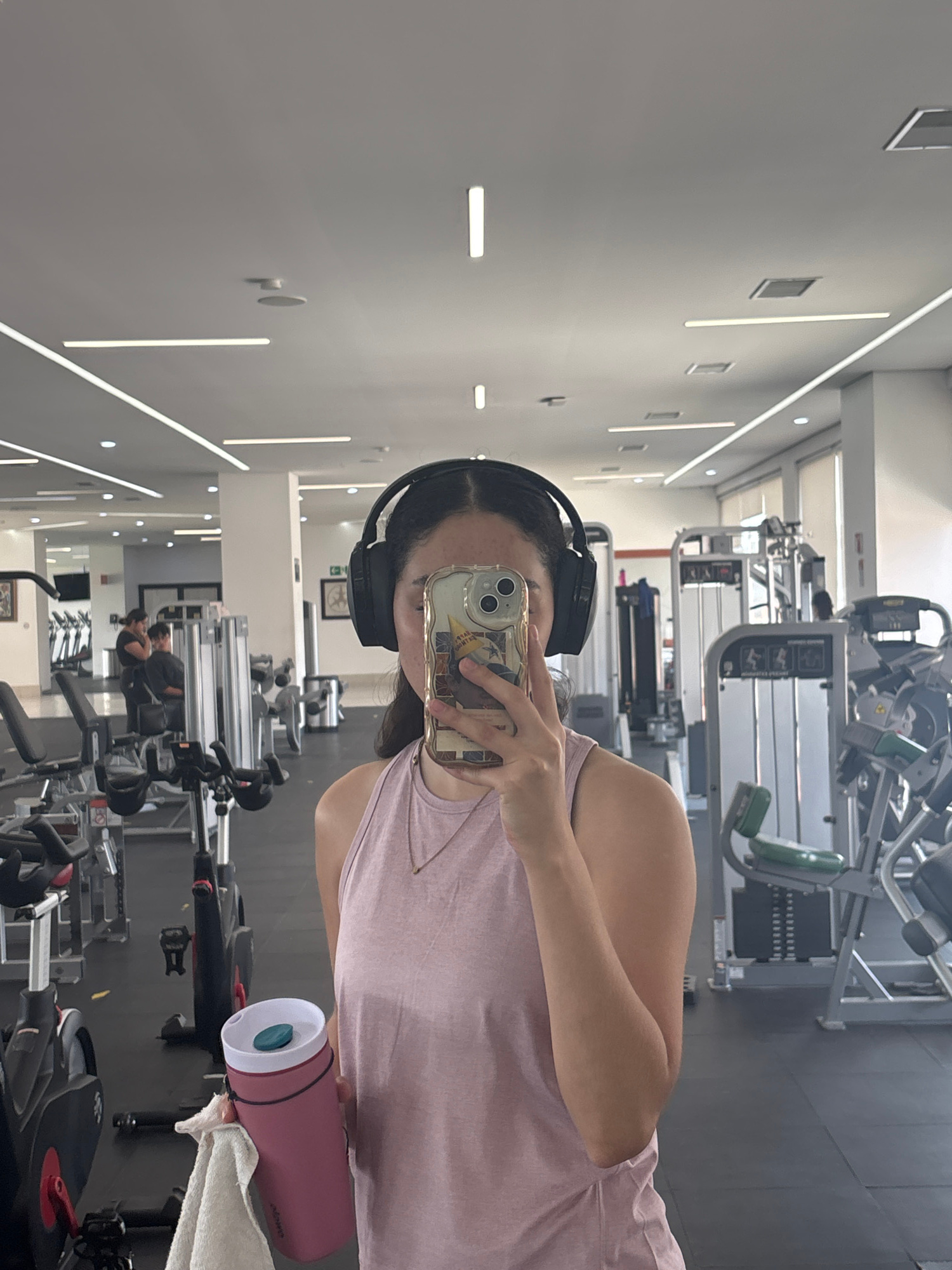 A person in a gym setting holds a phone up to take a selfie, with a water bottle and towel visible in the foreground. The gym contains various exercise machines and equipment. The gym's walls are ligh…read more