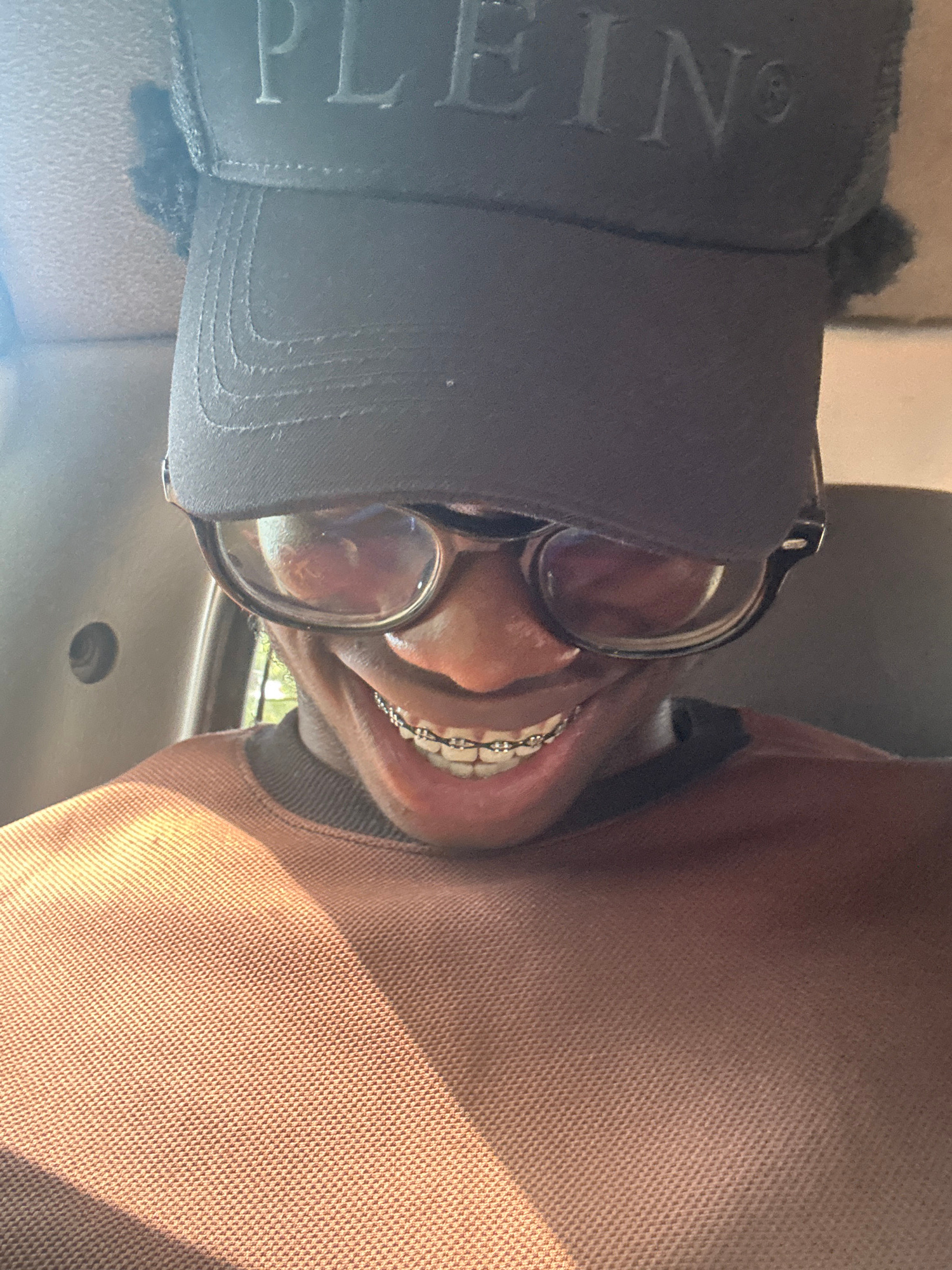 The image shows a person wearing a black cap with the text "PLEIN" visible on the left side. The person is also wearing glasses and has braces on their teeth. The individual's skin tone appears to be…read more