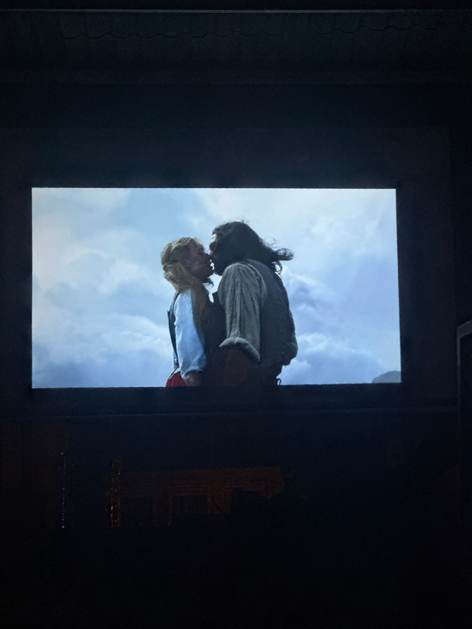 A television screen displays a scene of a man and a woman with blonde hair embracing against a backdrop of blue sky and clouds. The television is surrounded by a dark room. The location is Unknown, Un…read more