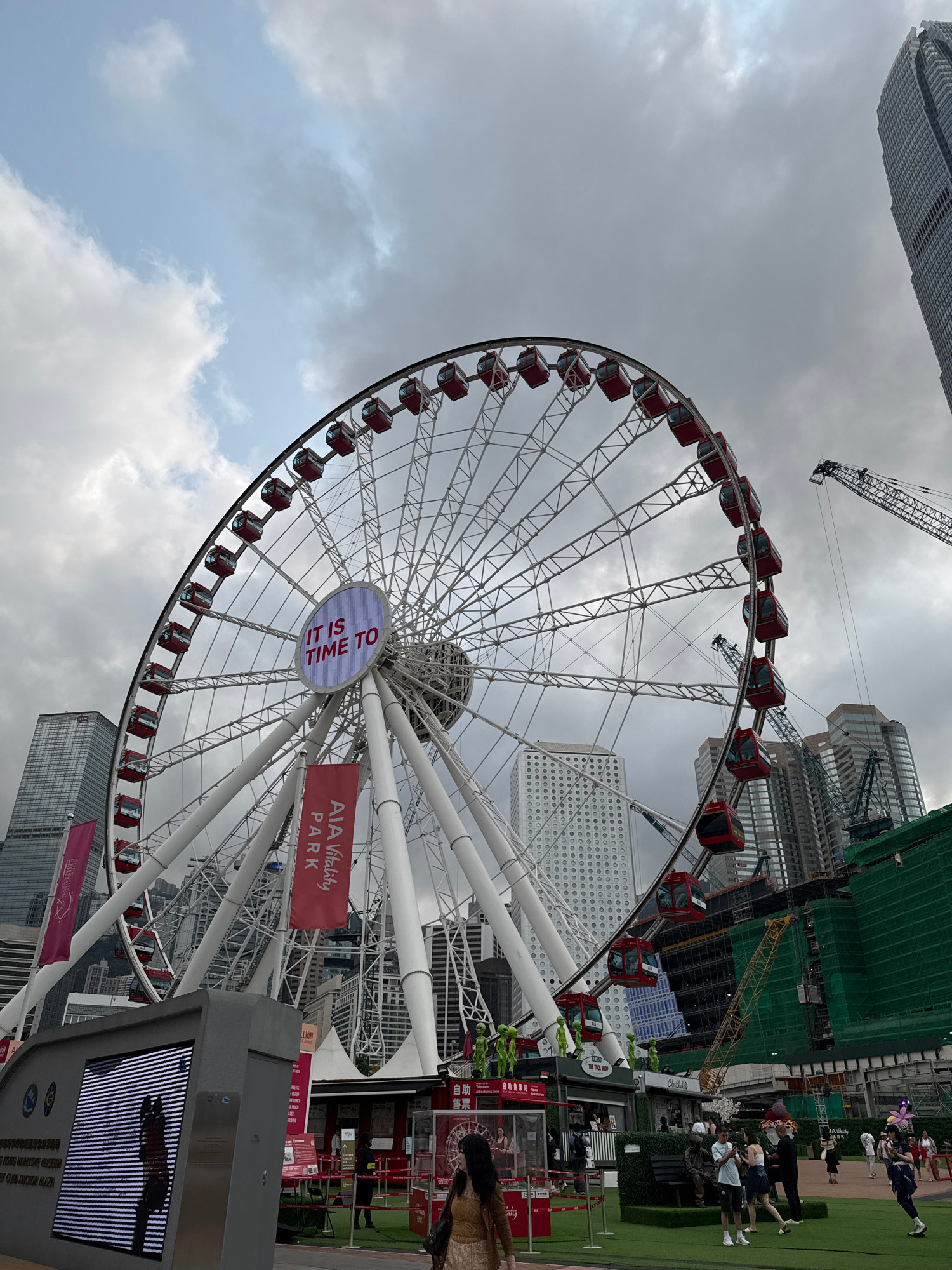 Here's a detailed description of the image: The image captures a Ferris wheel in Hong Kong, China. The wheel, painted white with red gondolas, is the central focus. A large circular sign at the hub…read more