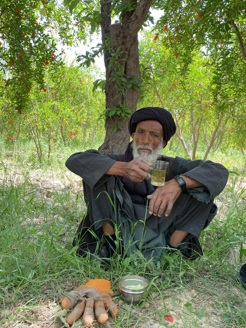An elderly Afghan man, with a long white beard and mustache, sits cross-legged on the ground in a pomegranate orchard in Nowruzi, Afghanistan. He wears a black turban and dark traditional clothing, le…read more
