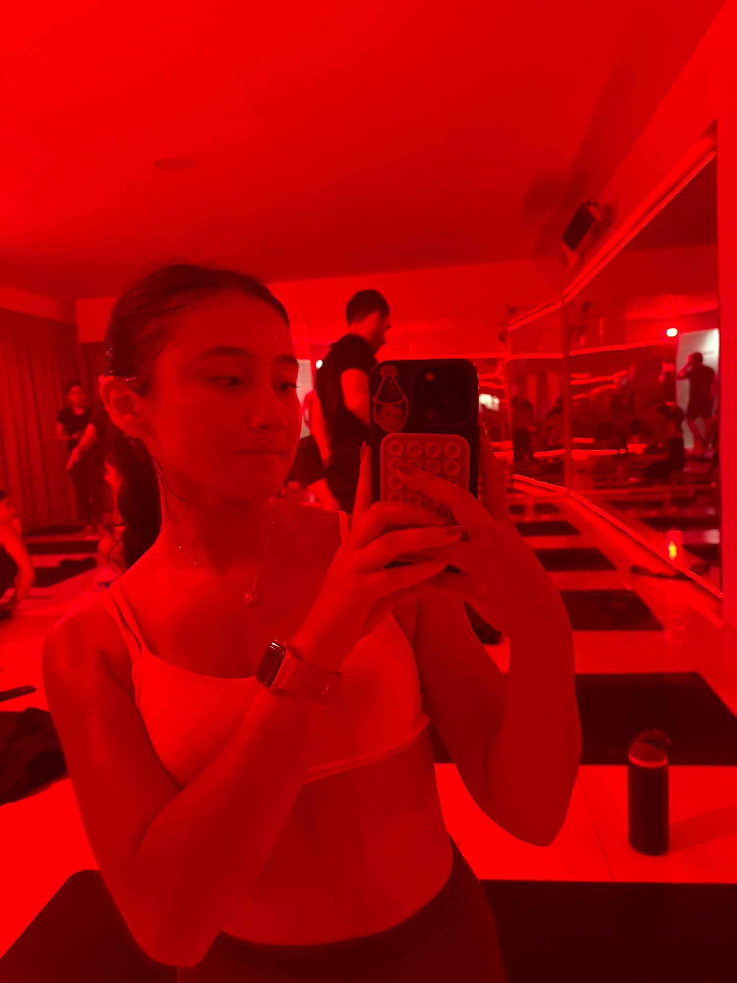 A woman is taking a selfie in a red-lit environment, possibly a fitness studio, as evidenced by workout equipment and other individuals in the background. She's wearing athletic attire, including a sp…read more