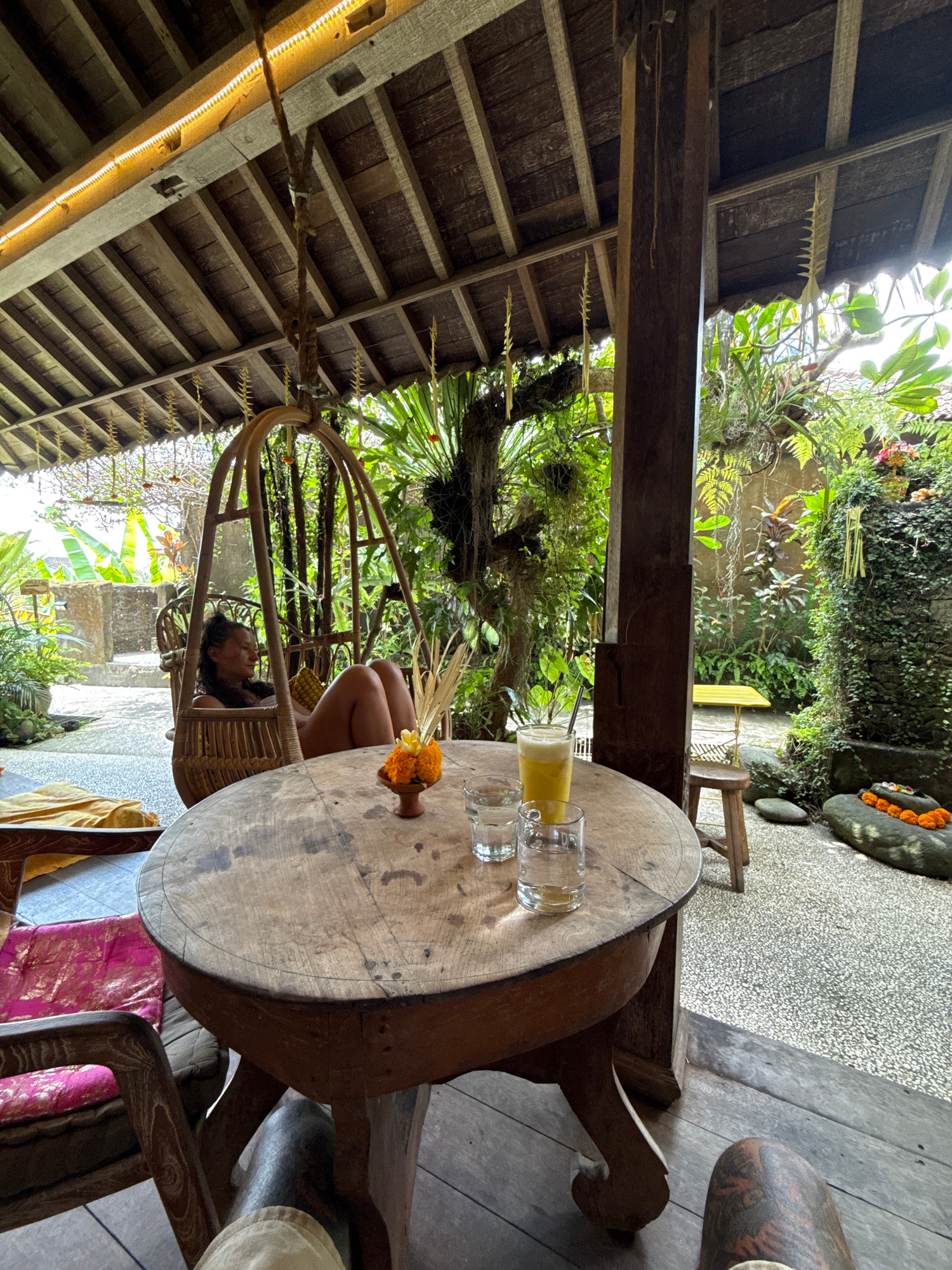 A medium indoor-outdoor shot looking up and across a circular table and a person in a swing chair in the Ubud District, Indonesia. A round, wood table sits to the right of the frame. On the table are…read more