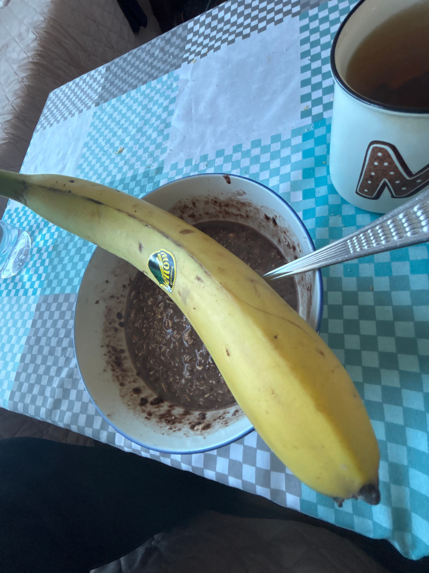 A top-down shot displays a light blue and white checkered tablecloth. A large, yellow banana overlays a white bowl containing a dark brown, mushy substance, possibly oatmeal or porridge. A silver spoo…read more