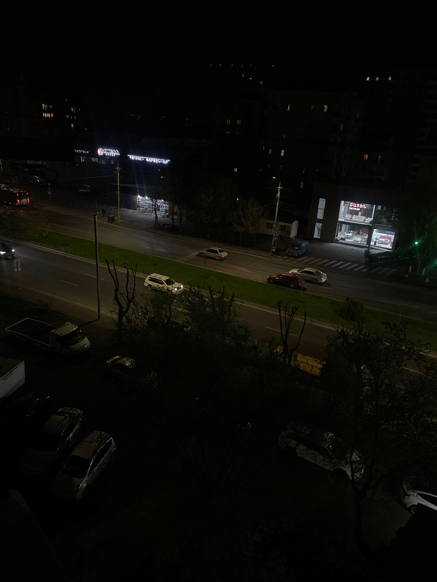 This is an aerial night shot of Yerevan, Armenia. The main street runs diagonally through the frame, lined with buildings. Several vehicles are moving along the street, with some parked on the sides.…read more