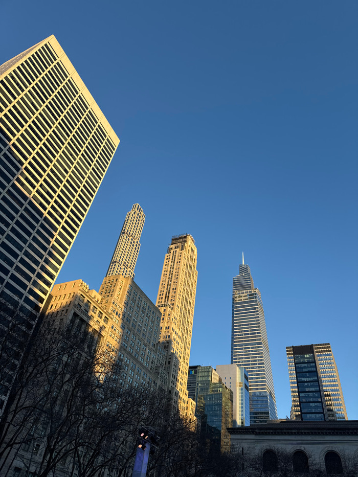 A low-angle perspective captures several skyscrapers against a clear blue sky. The buildings vary in architectural style, from the grid-like facade of a modern tower to the ornate, stepped design of o…read more