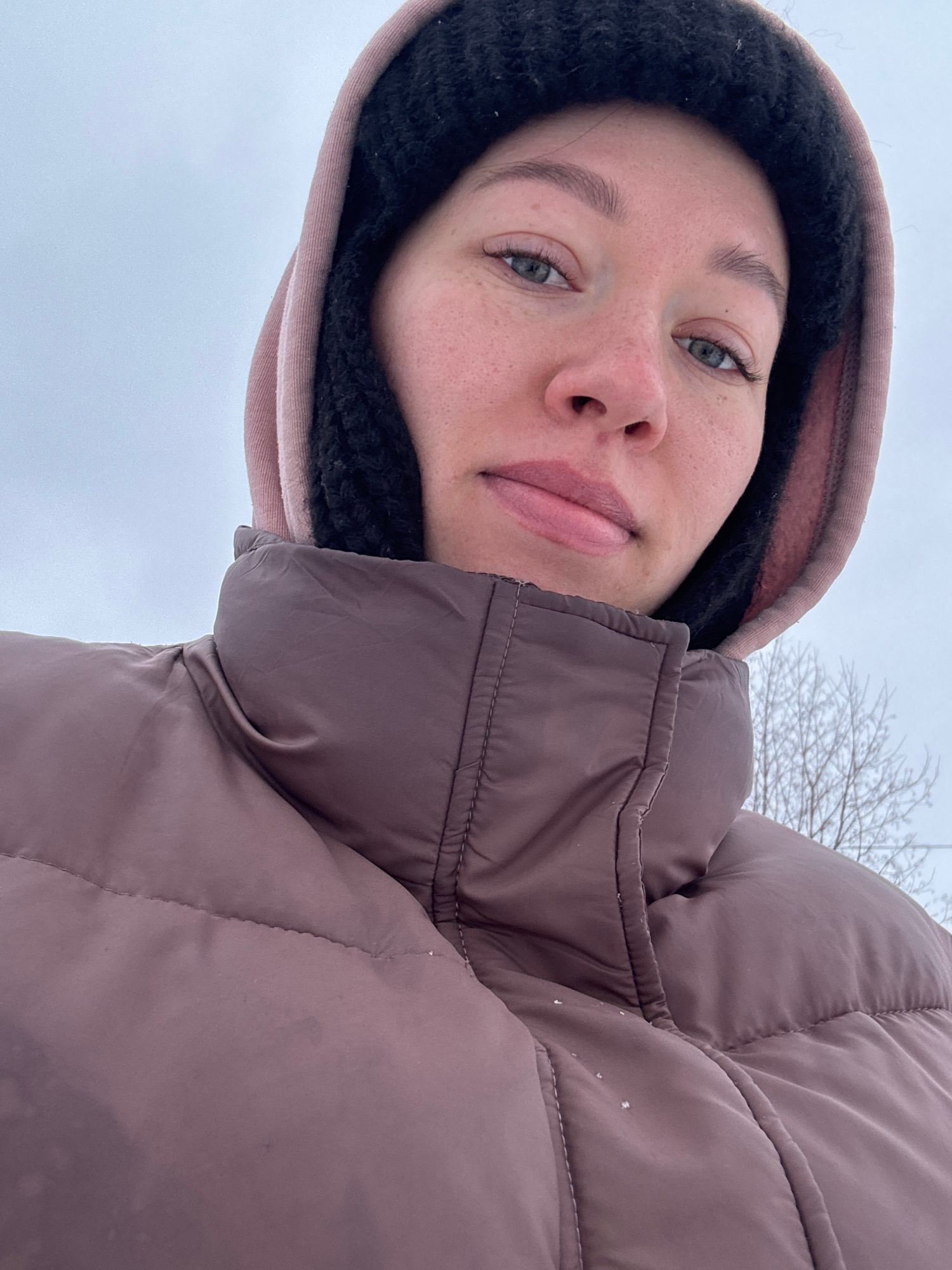 A close-up, low-angle shot shows a woman wearing a puffy, taupe-colored winter coat with a hood. The hood is lined with black fleece and has a pinkish-brown outer layer. The woman has fair skin, freckles, light eyes, and full lips. She is looking downward toward the camera with a slight smile. The background consists of a pale sky and bare branches of a tree. Based on the sky color and the type of clothing worn, the location appears to be cold, possibly winter. The location is in the city of Ферма, Russia. | Open Wire