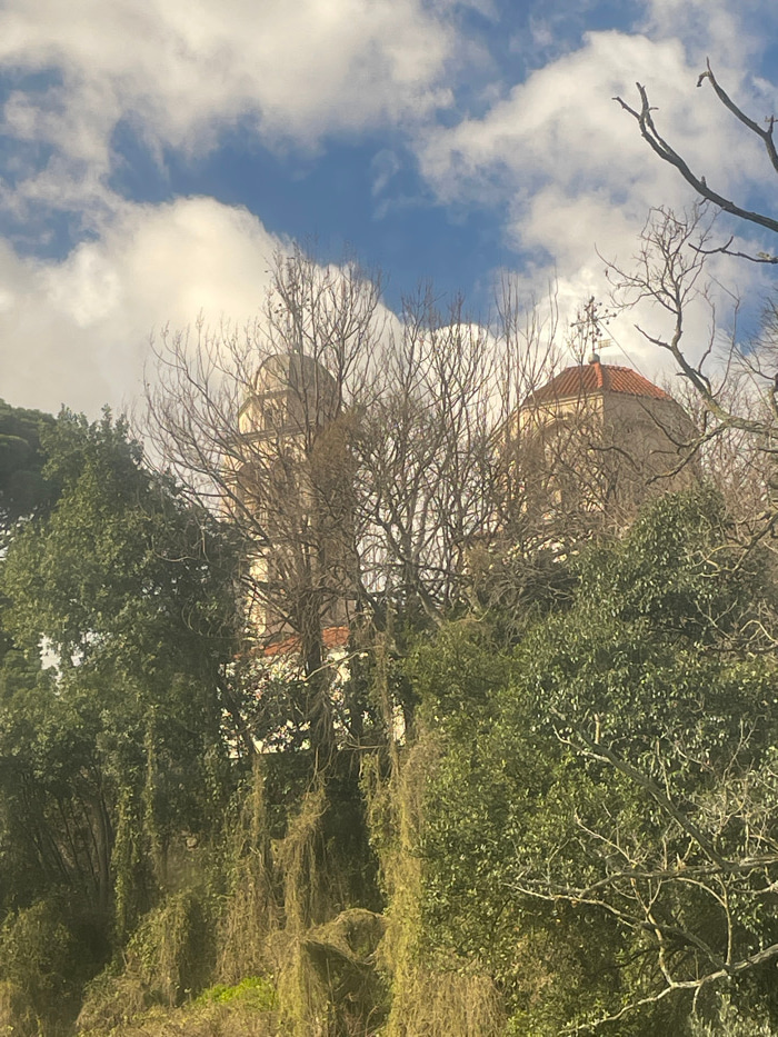 The image displays a partial view of the Savina Monastery complex in Herceg Novi, Montenegro, observed from a lower vantage point through dense vegetation. In the background, under a blue sky with sca…read more