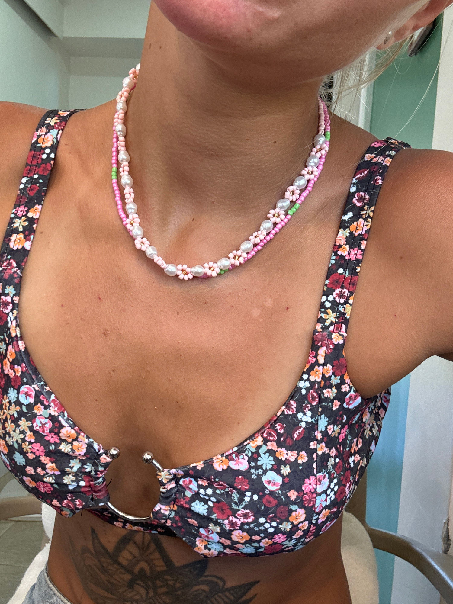 This image shows a close-up of a person's upper torso wearing a floral bikini top and a beaded necklace. The bikini top has a dark background with colorful floral patterns and a metal ring detail in t…read more