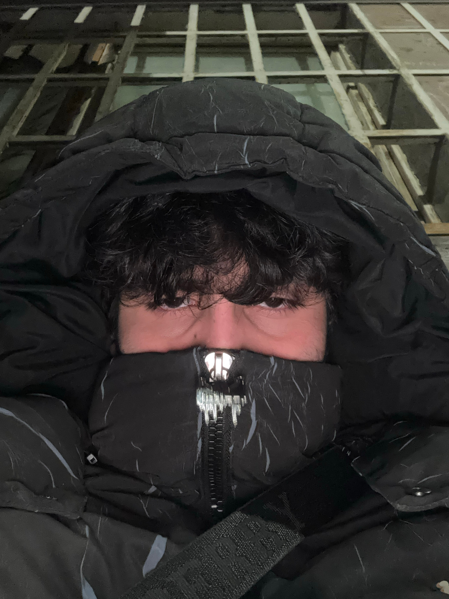A person is seen in the image wearing a black, hooded puffer jacket, with the hood pulled up, obscuring most of their face except for the eyes and some of their dark, curly hair. The jacket is zipped…read more