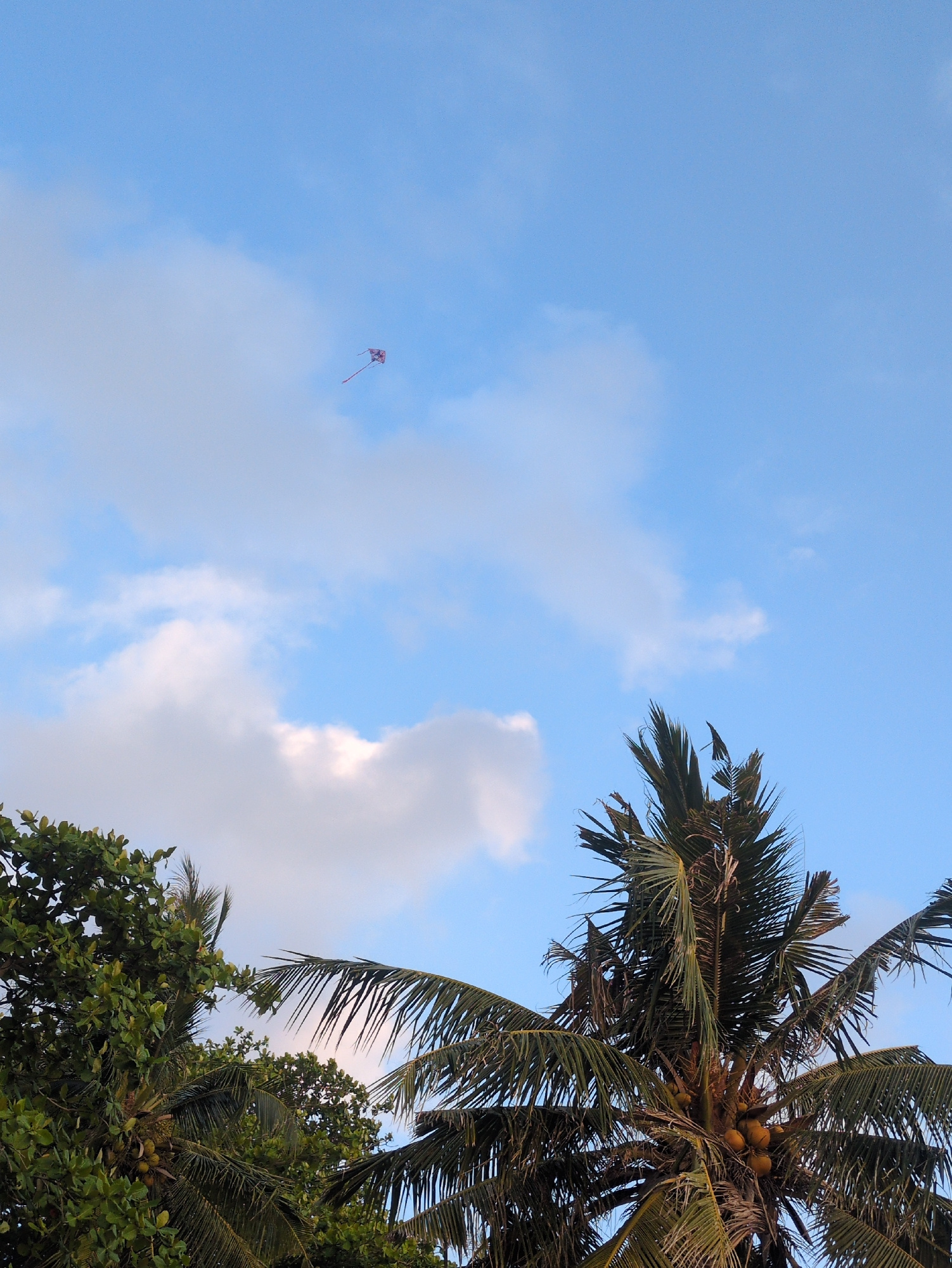A low-angle shot of the sky on Phú Quốc, Vietnam, shows a blue sky with scattered clouds. A red kite flies at the left side of the image. Coconut and tropical trees are on the right side of the frame.…read more