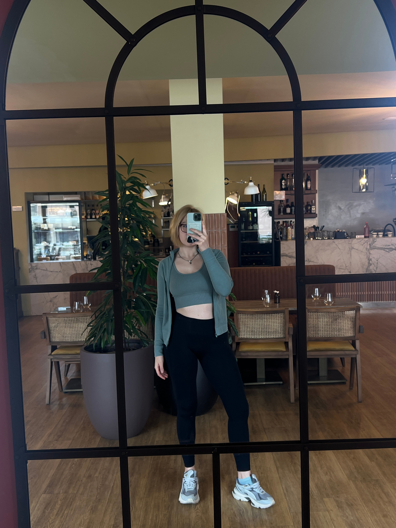 A woman in athletic attire (green top, black leggings, gray running shoes) is taking a selfie in a mirror with a complex frame, likely indoors. The reflection shows a restaurant interior with tables,…read more