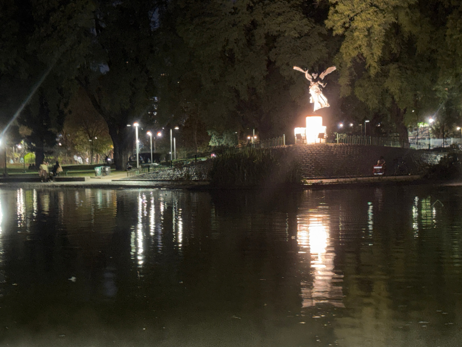 The image shows a nighttime view of a lake in Parque 3 de Febrero (also known as Bosques de Palermo), a large park in Buenos Aires, Argentina. The lake reflects the lights and some of the surrounding…read more