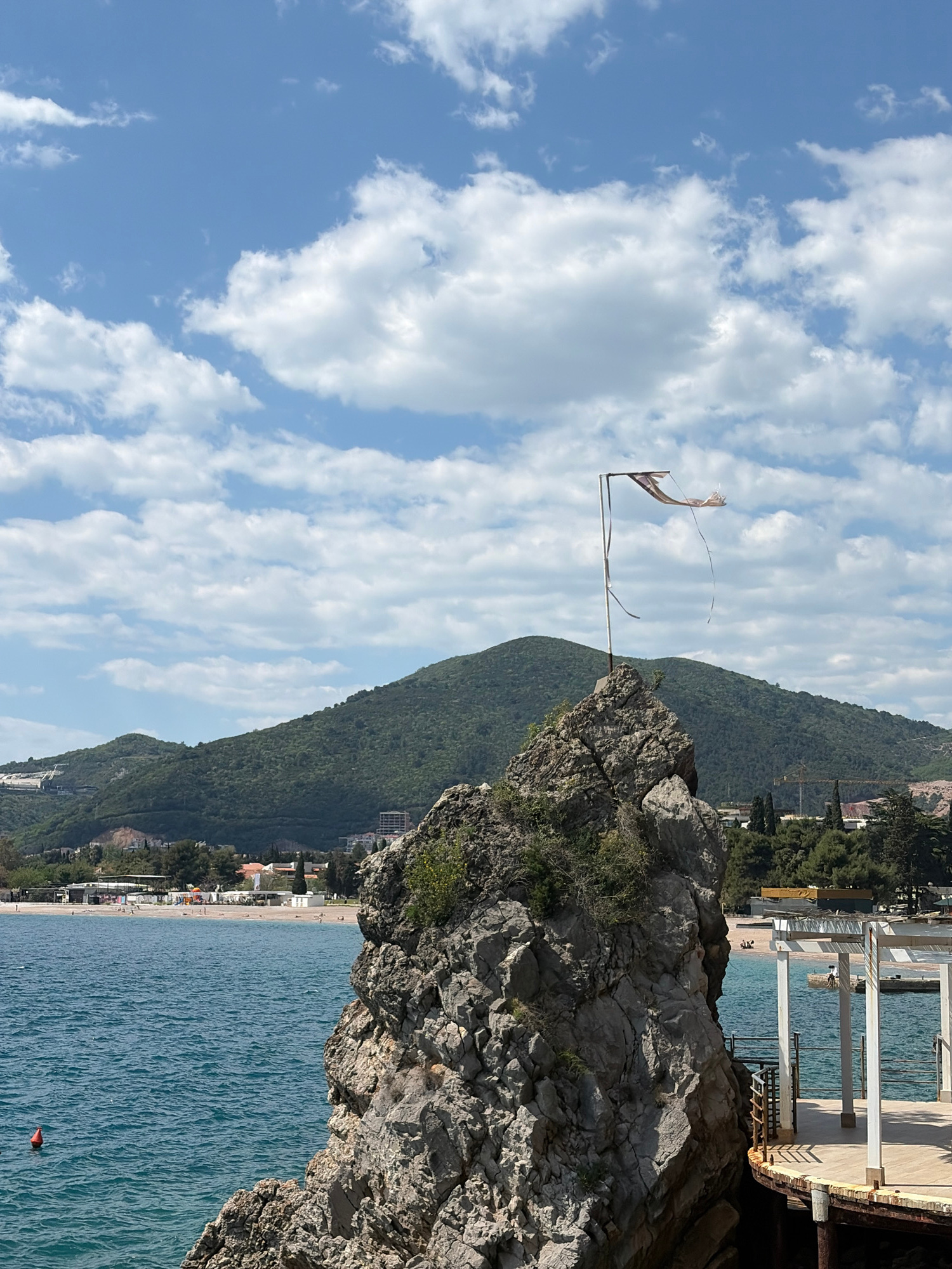 The image captures a scene in Budva, Montenegro, featuring a rocky cliff overlooking the Adriatic Sea. A tattered flag is attached to a makeshift flagpole on the cliff's edge. Behind the cliff, a gree…read more