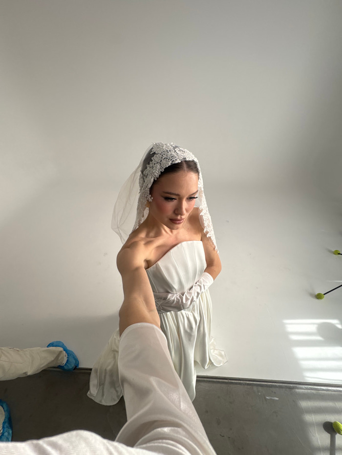 This image captures a female subject posing in a photography studio located in Bat Yam, Israel. The studio features a seamless white cyclorama backdrop and a two-toned floor, transitioning from white…read more