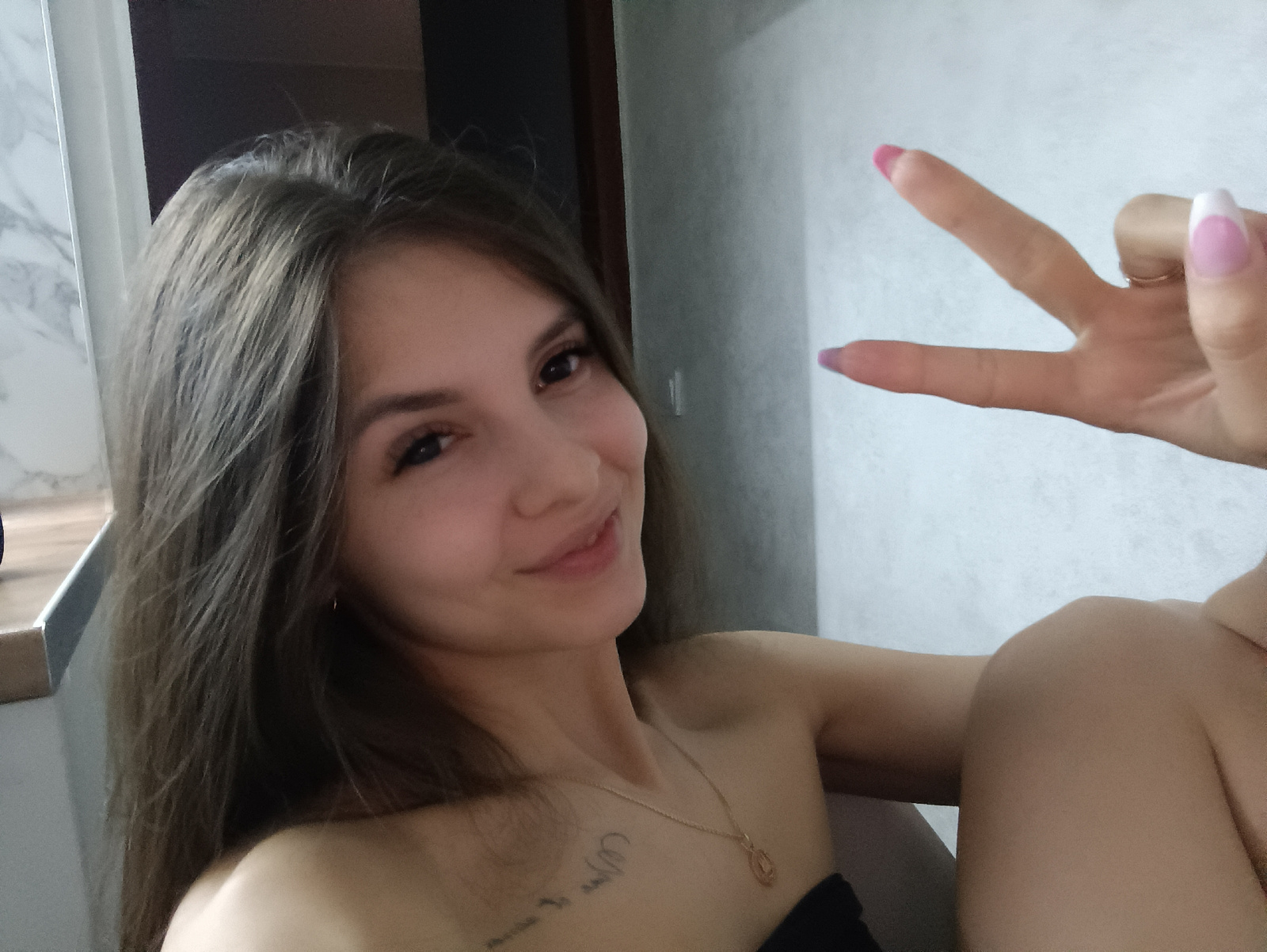 A young woman poses for a selfie in an indoor setting. She is smiling and making a peace sign with her right hand. She has long, dark brown hair and appears to be wearing a tube top. A gold necklace w…read more