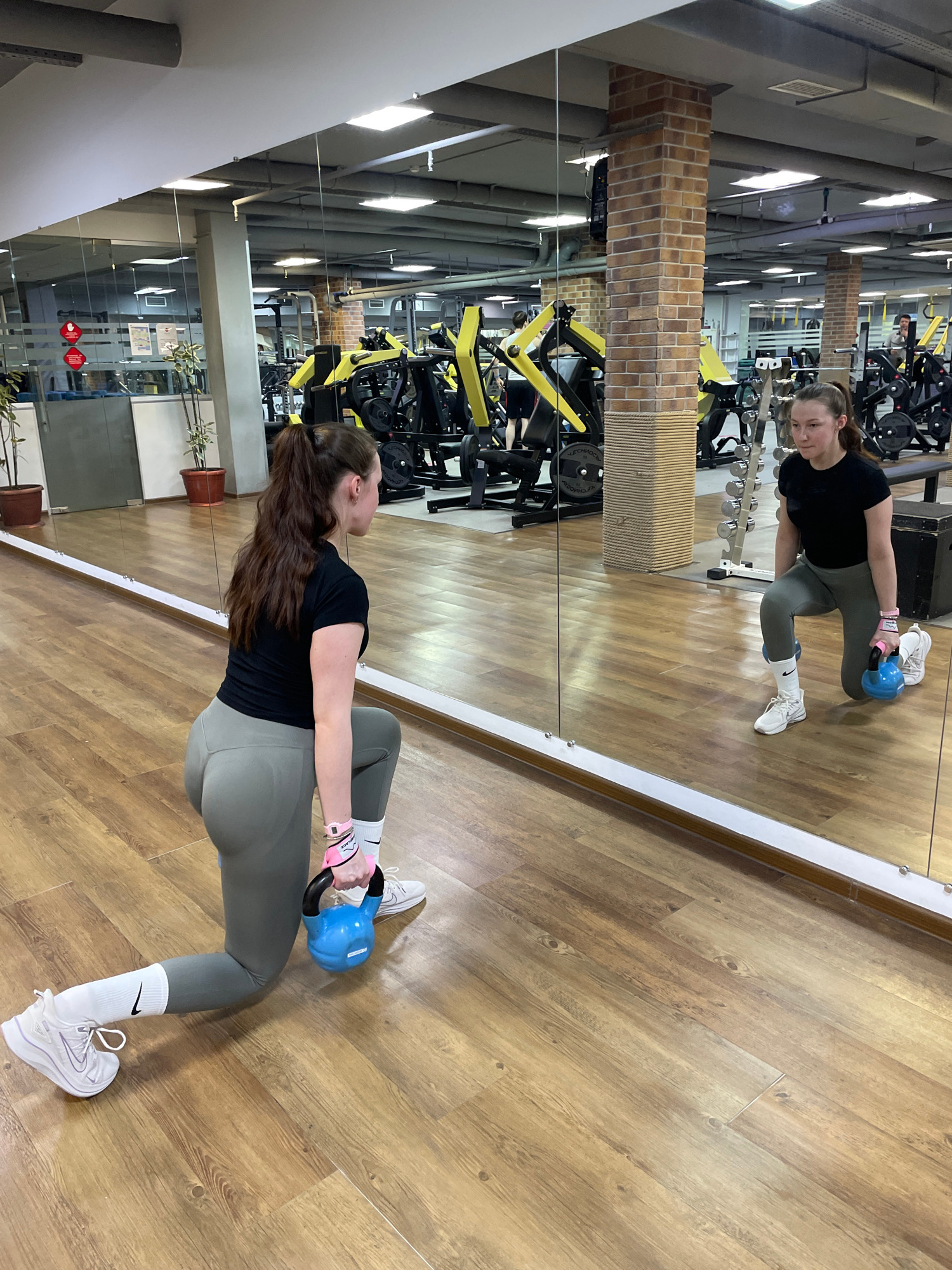 A woman is performing a squat exercise with a blue kettlebell in a gym. She is reflected in a large mirror. She is wearing a black T-shirt, grey leggings, white athletic shoes and socks with a Nike lo…read more