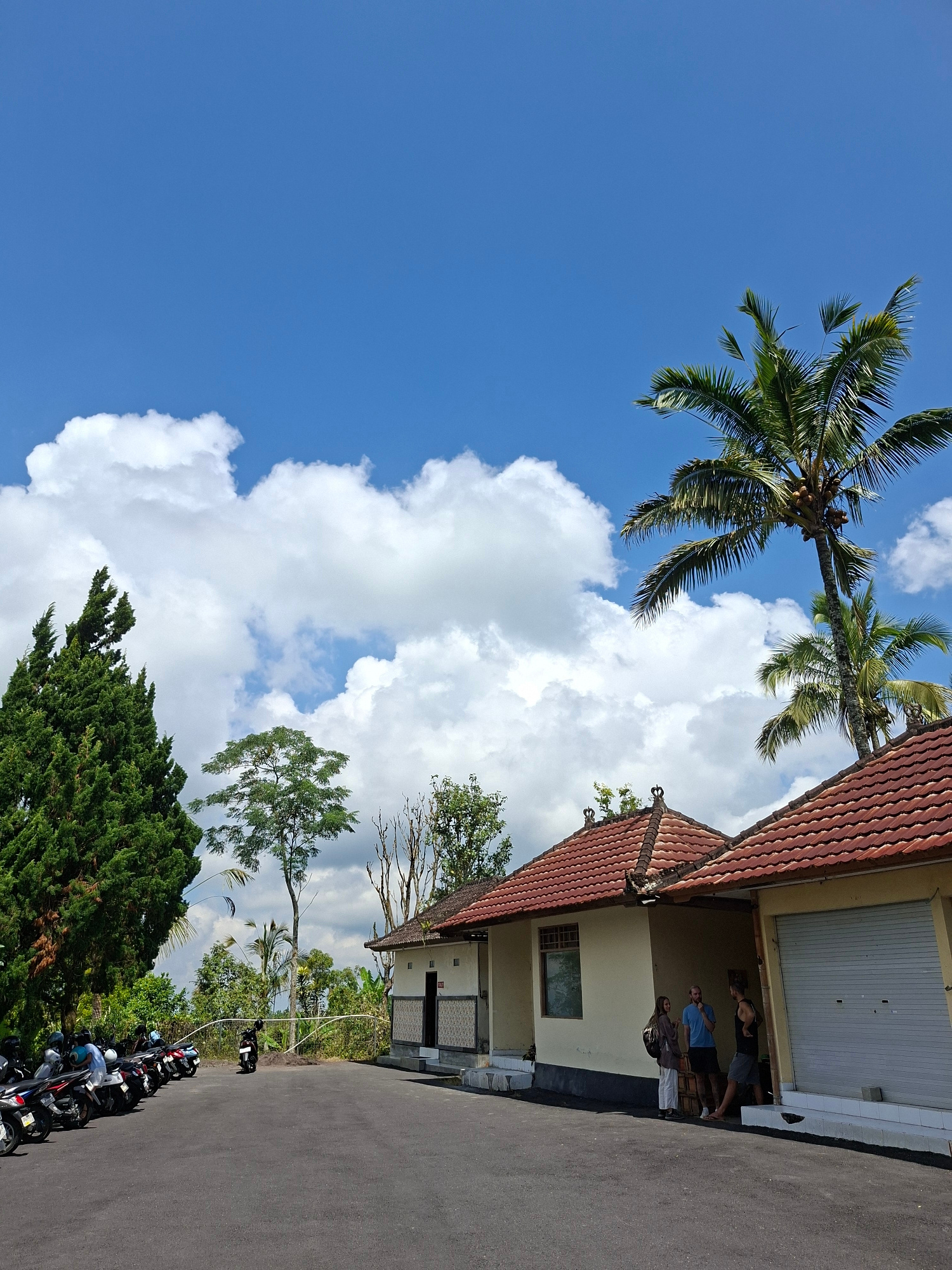 The image shows a sunny daytime scene in Petang, Indonesia. The sky is blue with puffy white clouds. A tall palm tree stands at the top left, partially obscuring the sky. Adjacent to the palm tree is…read more