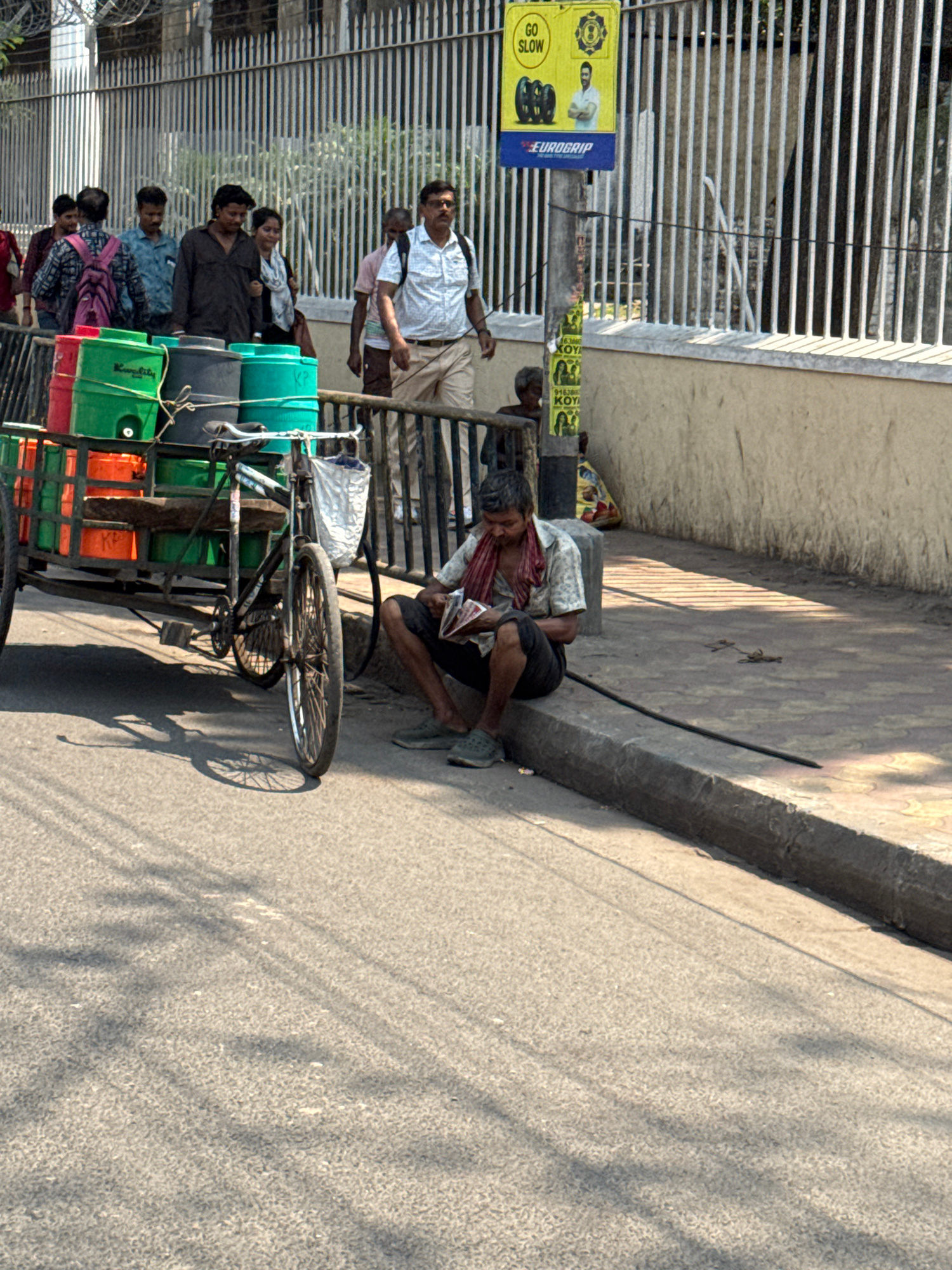 The image depicts a street scene in Kolkata, India. A group of people are walking alongside a road. A cycle rickshaw loaded with colorful containers stands near the sidewalk. A man reclines on the sid…read more
