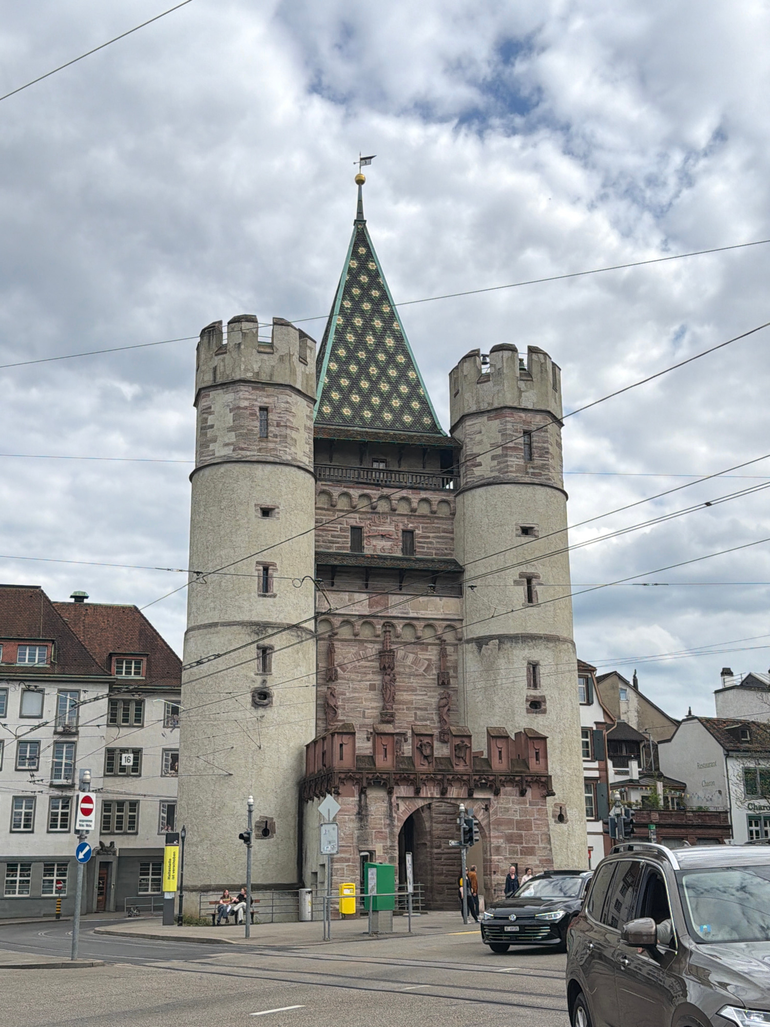 This vertical image captures the historic Spalentor (Spalen Gate) in Basel, Switzerland, under an overcast sky. The prominent central feature is the gatehouse, flanked by two imposing, rounded towers.…read more