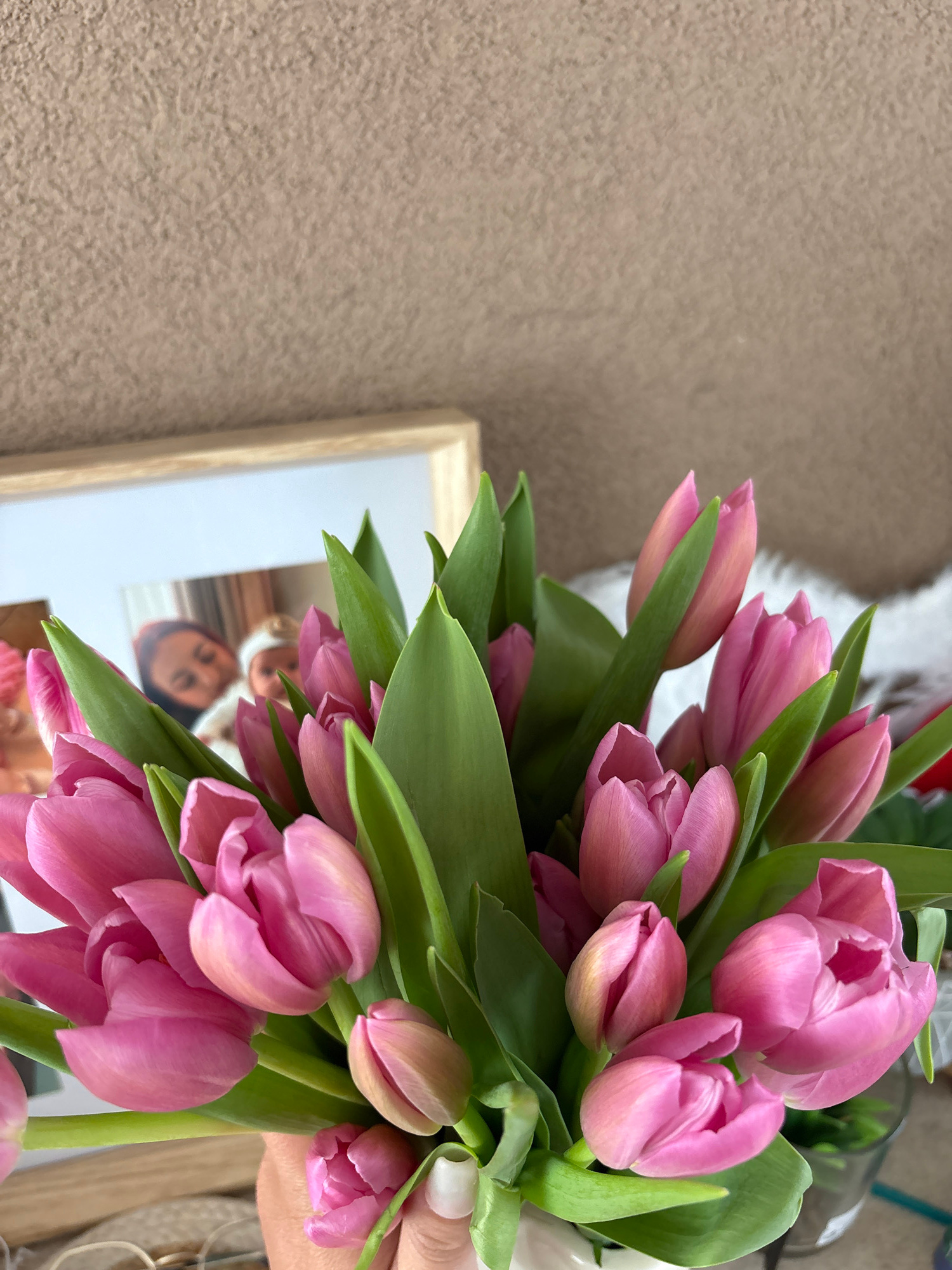 The image features a bouquet of pink tulips. A picture frame sits behind and to the left of the bouquet. The frame appears to contain a photo of people. The background behind the frame and tulips is a…read more