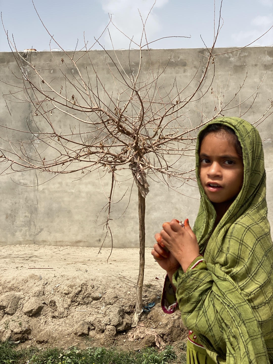 A young girl stands in front of a leafless tree against a grey wall. She is wearing a green headscarf and a green, patterned shawl. Her hands are clasped together. The ground is mostly dirt with someβ¦read more