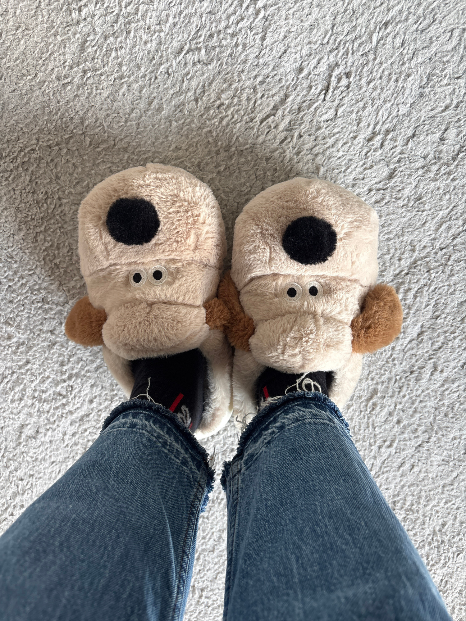 The image shows a person wearing blue jeans and black socks with red stripes, and a pair of plush dog-shaped slippers. The slippers are off-white with brown floppy ears and black nose patches. The per…read more
