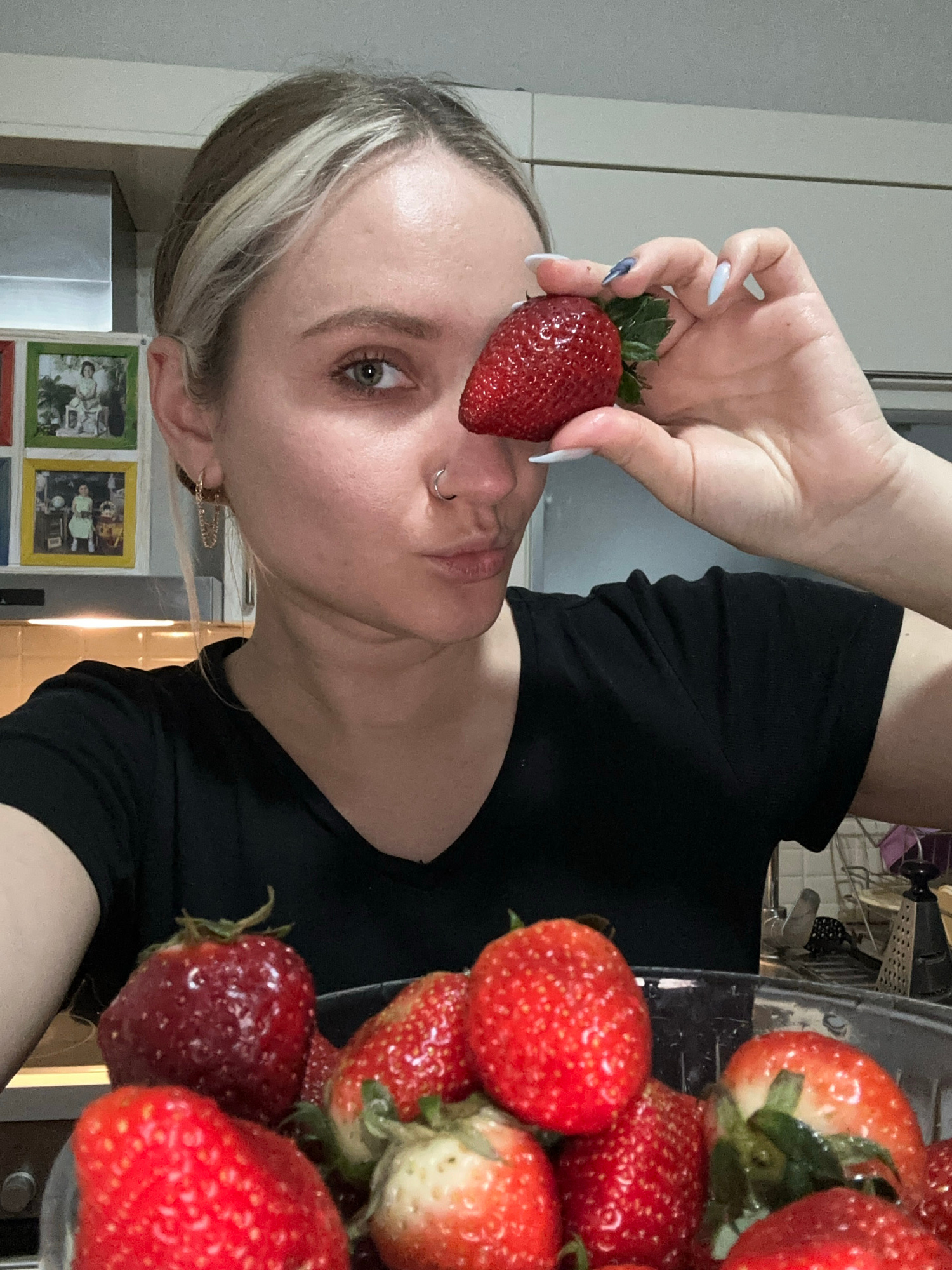 A woman with blonde highlights is holding a strawberry up to her face in an indoor setting. She is wearing a black shirt. A bowl of strawberries is visible next to her, and kitchen appliances and fram…read more
