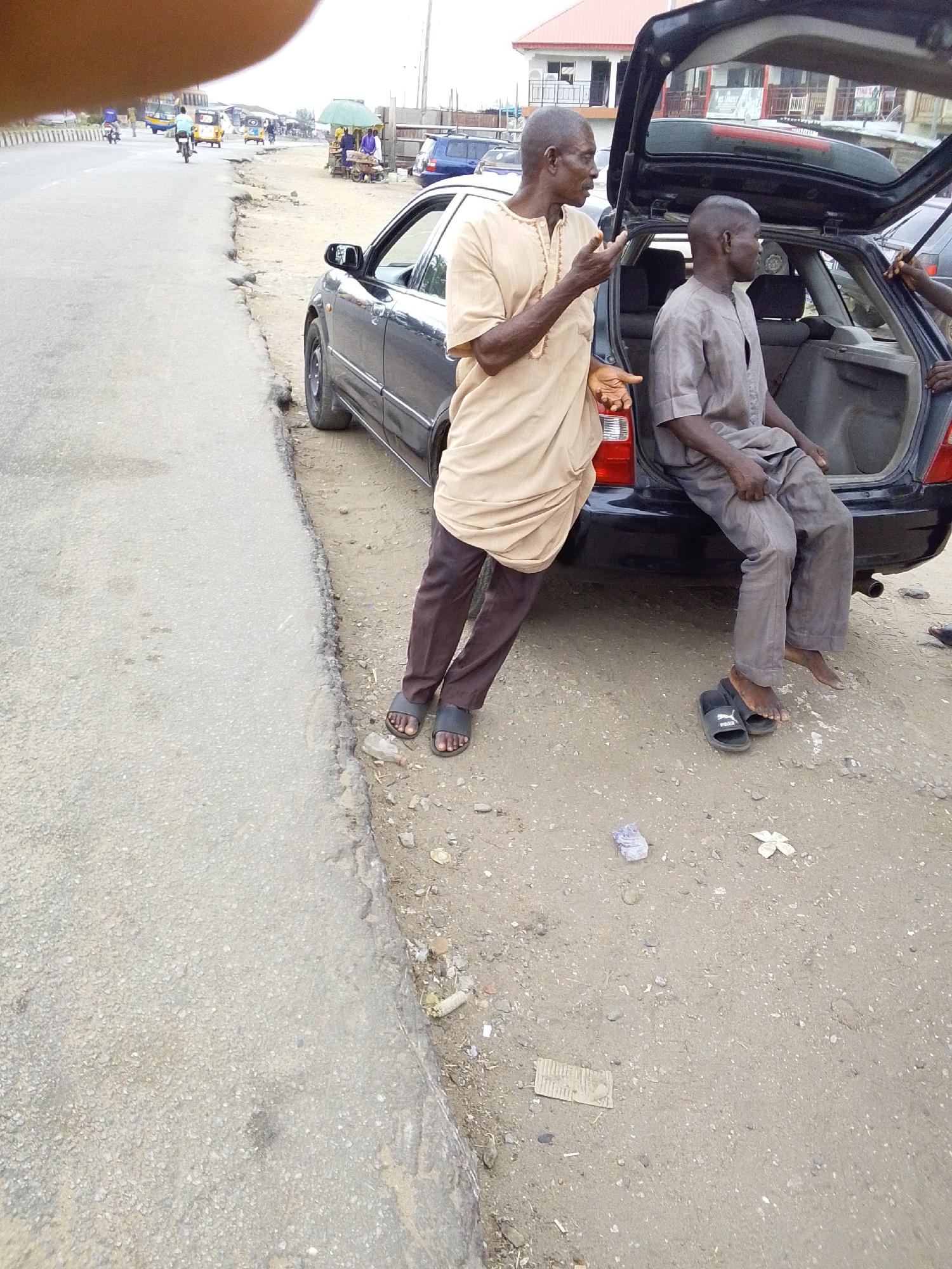 Two middle-aged African men are beside a black car with its trunk open on a dirt shoulder adjacent to a paved road. One man is standing, wearing a long tan shirt and dark pants, gesturing with his rig…read more
