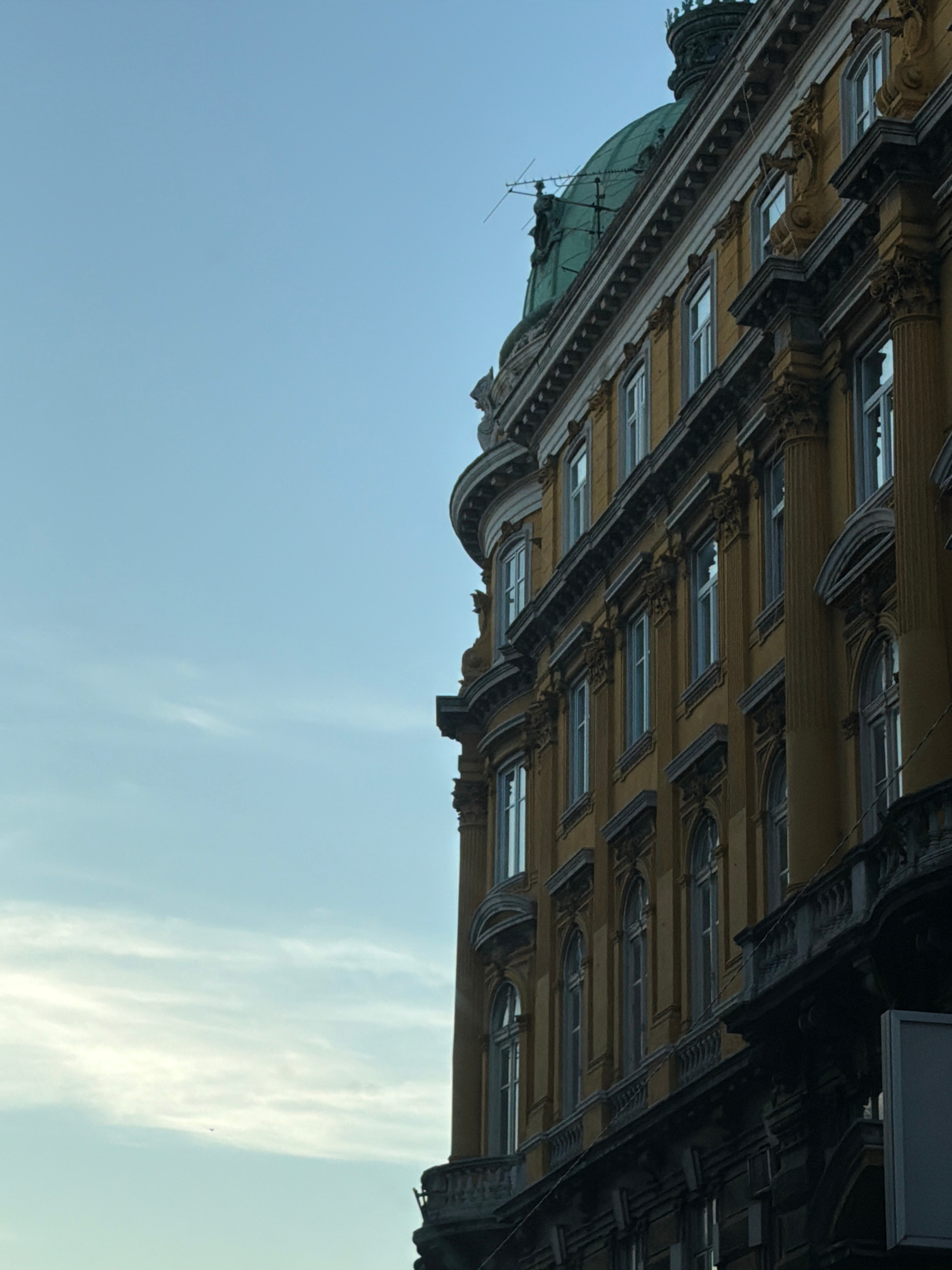 The image depicts an upward view of a building in Grad Rijeka, Croatia. The building is a classical style, with ornate details, columns, and a green domed roof. The sky is blue with wisps of clouds vi…read more