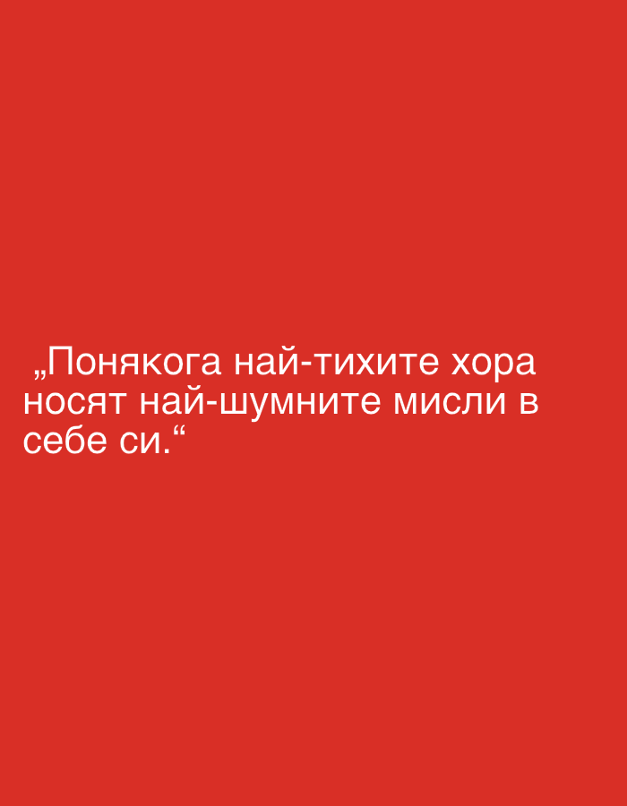 The image is a red background with white text in Bulgarian that reads: "Понякога най-тихите хора носят най-шумните мисли в себе си." This translates to "Sometimes the quietest people carry the loudest…read more