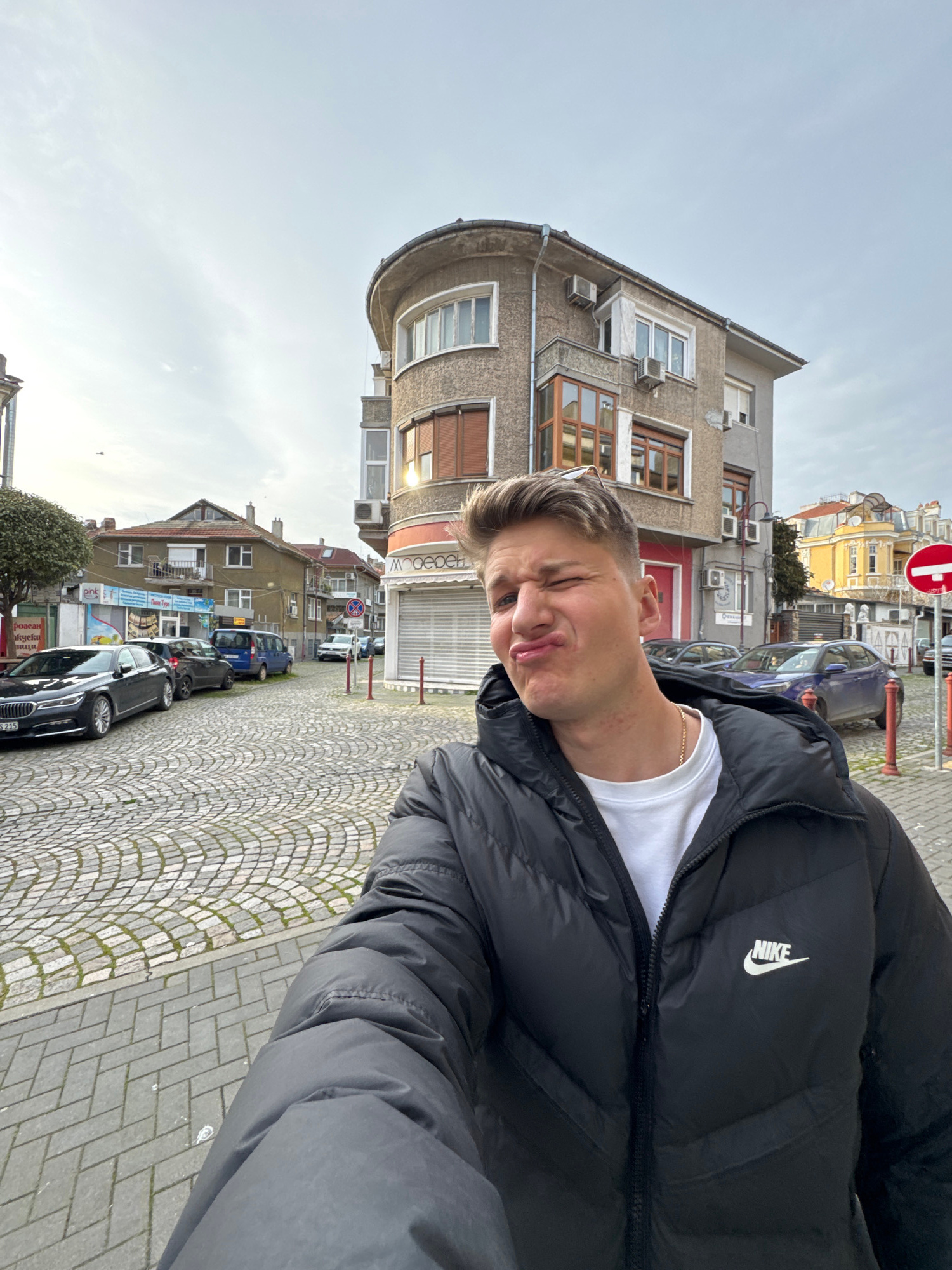 A young man stands on a cobblestone street in Burgas, Bulgaria. He wears a black Nike puffer jacket and a white t-shirt. A gold chain is visible around his neck. The man is making a comical face, with…read more