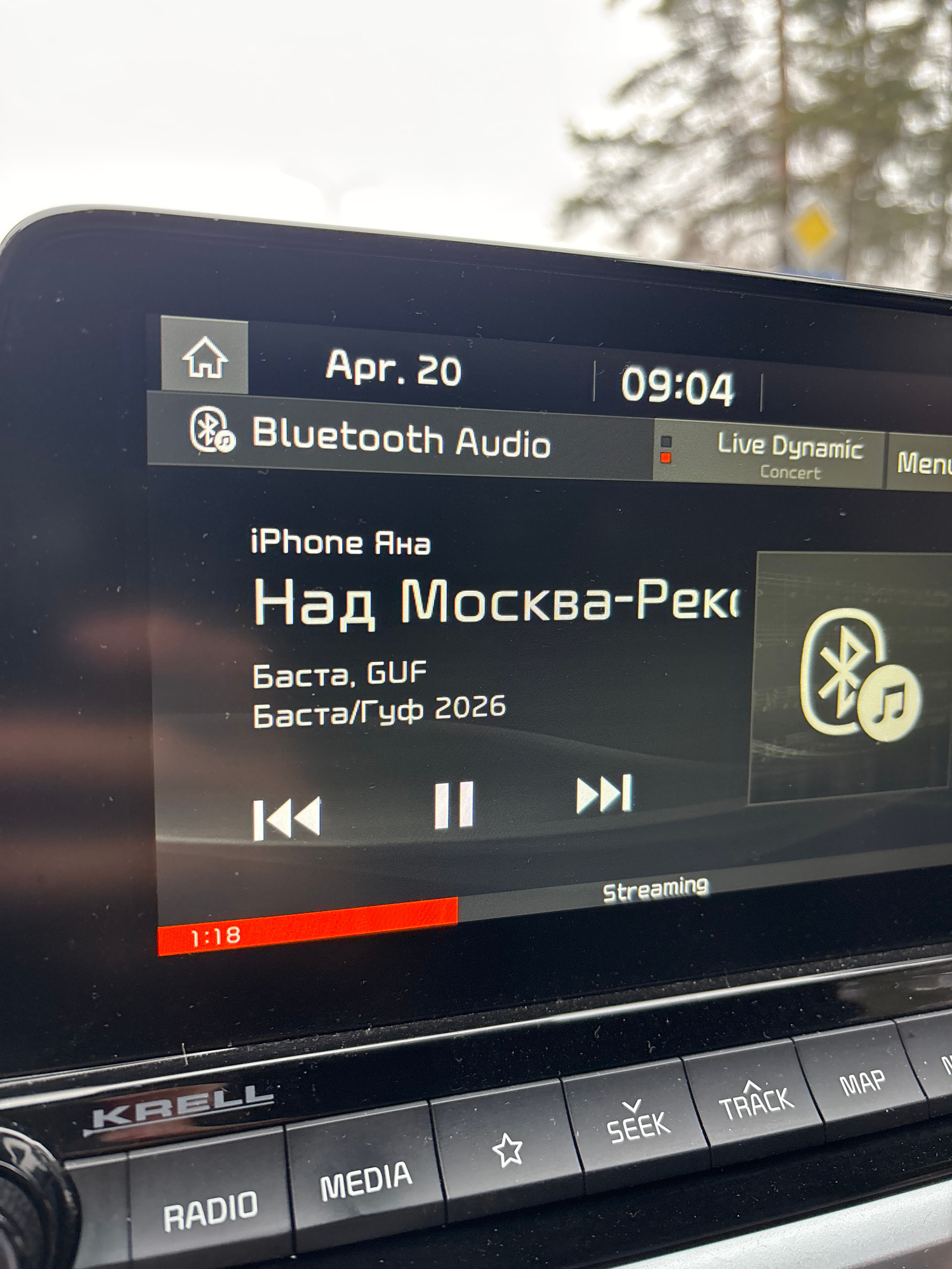 The image shows a car's infotainment screen displaying music information. The date is April 20th and the time is 09:04. The audio source is Bluetooth, connected to an iPhone named "Яна". The song play…read more