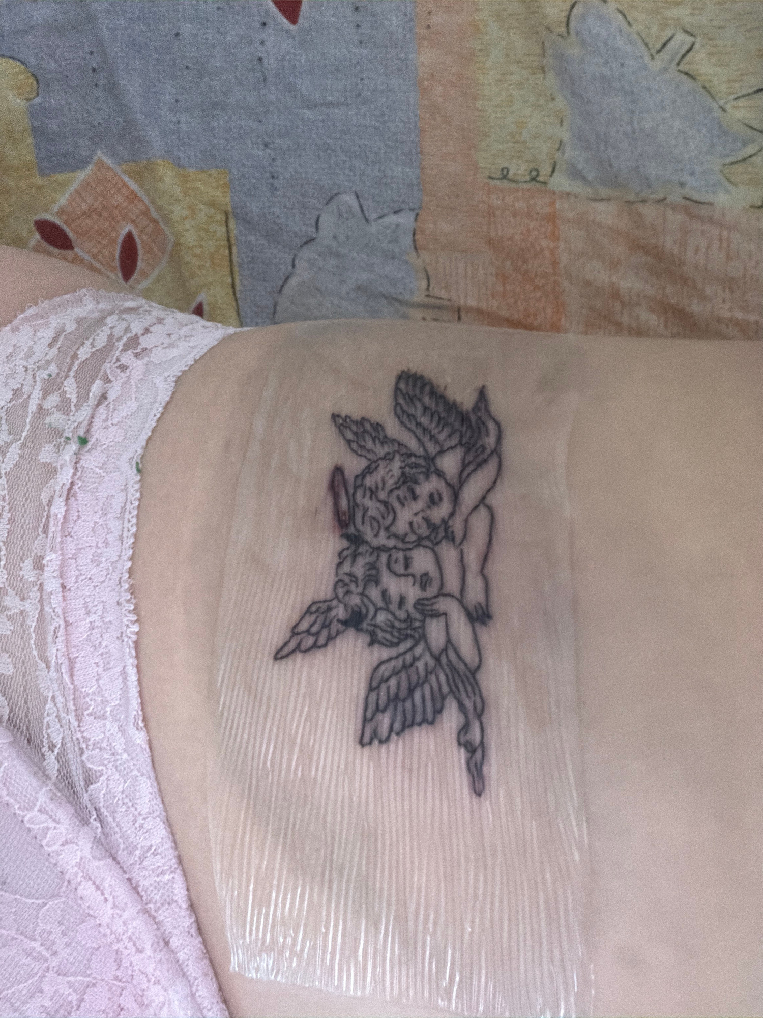 A close-up, indoor shot reveals the left side of a person's torso, featuring a freshly applied tattoo covered by a transparent protective film. The tattoo, rendered in black ink, depicts two winged ch…read more