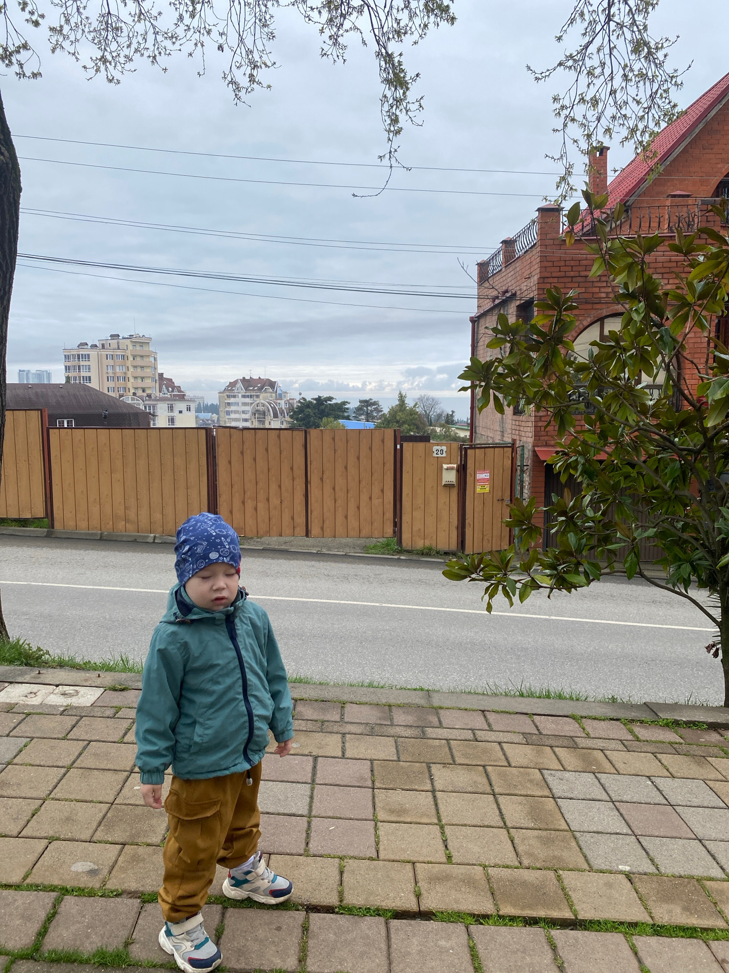 The image captures an outdoor urban scene in Sochi, Russia, under an overcast sky. A young child stands on a square-tiled concrete sidewalk in the foreground, positioned slightly left of the frame's v…read more