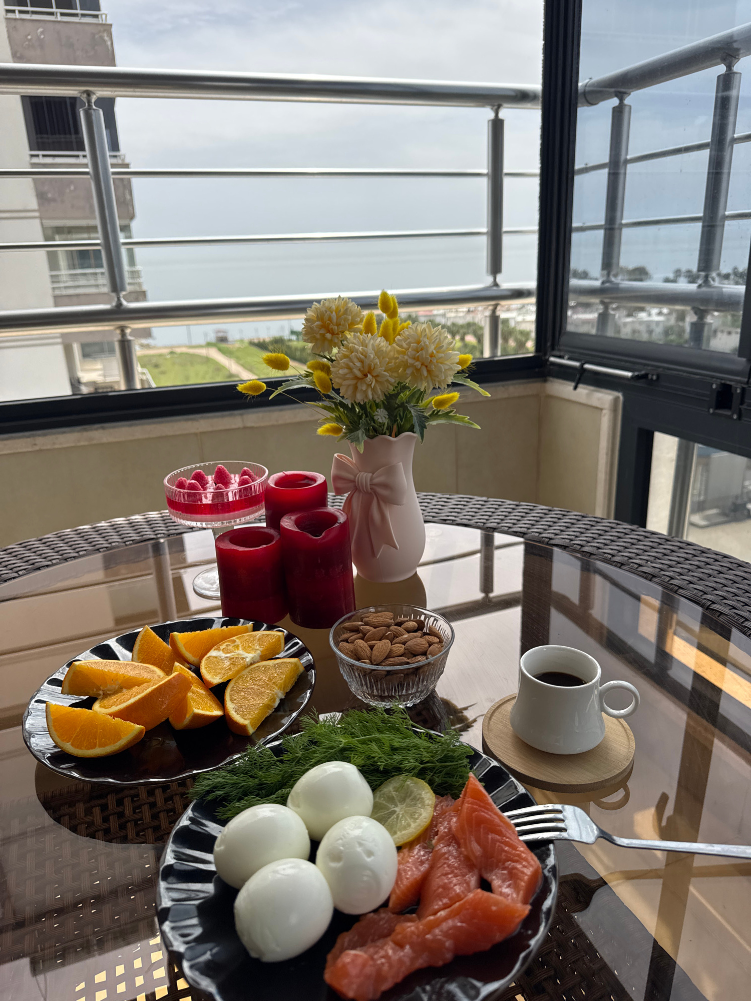 The image depicts a glass-topped table on a balcony with a view of Erdemli, Turkey. The table is set with various items: a white cup of coffee on a wooden coaster, a fork, a black plate with salmon, b…read more