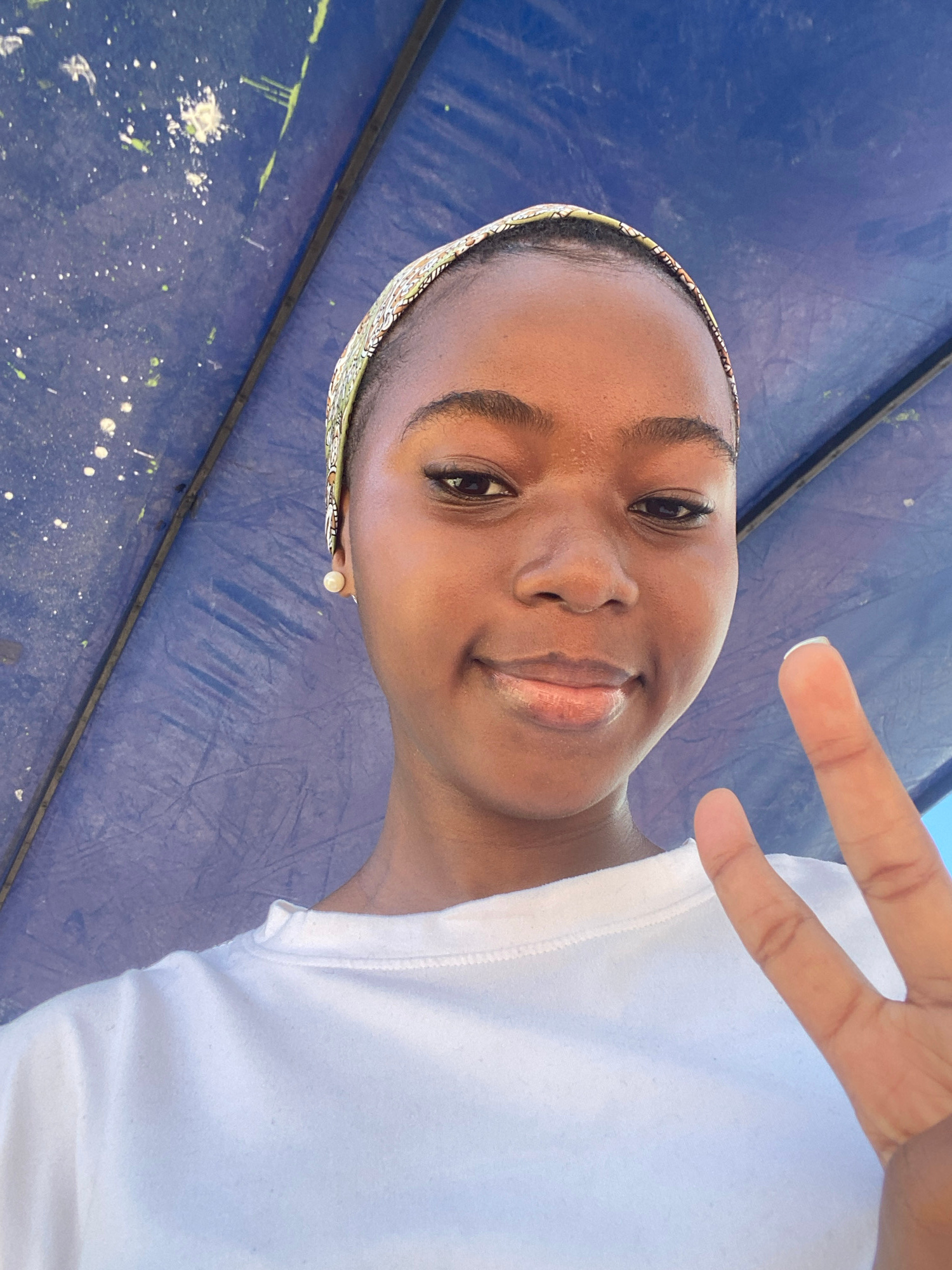 A young Black woman is seen in a close-up selfie. She wears a white t-shirt and a patterned headband. She is making a "peace" or "victory" sign with her fingers. She also wears a pearl earring. The ba…read more