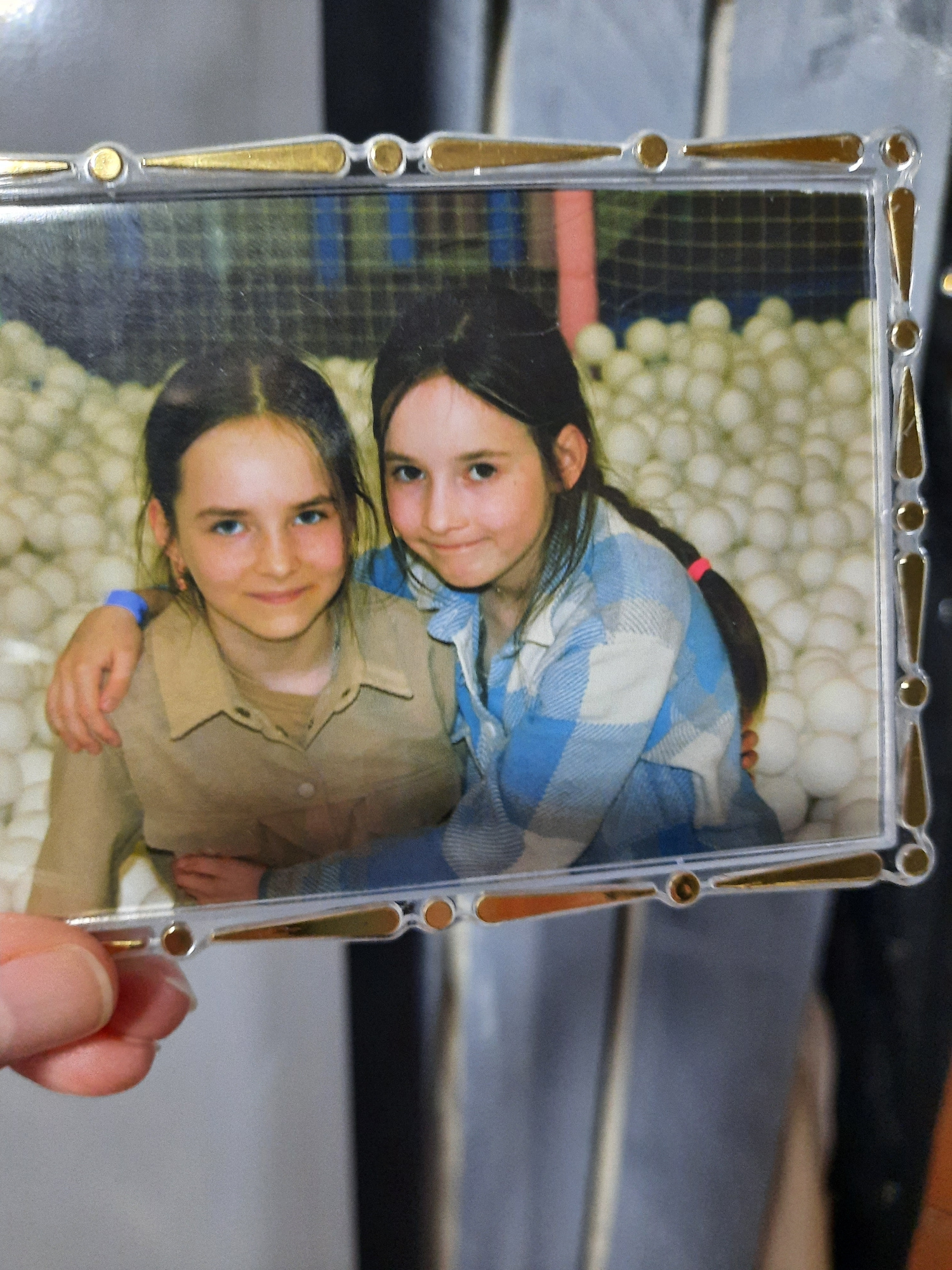 The image is a photograph held in a clear plastic frame with gold accents. Inside the frame is a picture of two young girls embracing, seemingly in a ball pit filled with white balls. The girl on top…read more