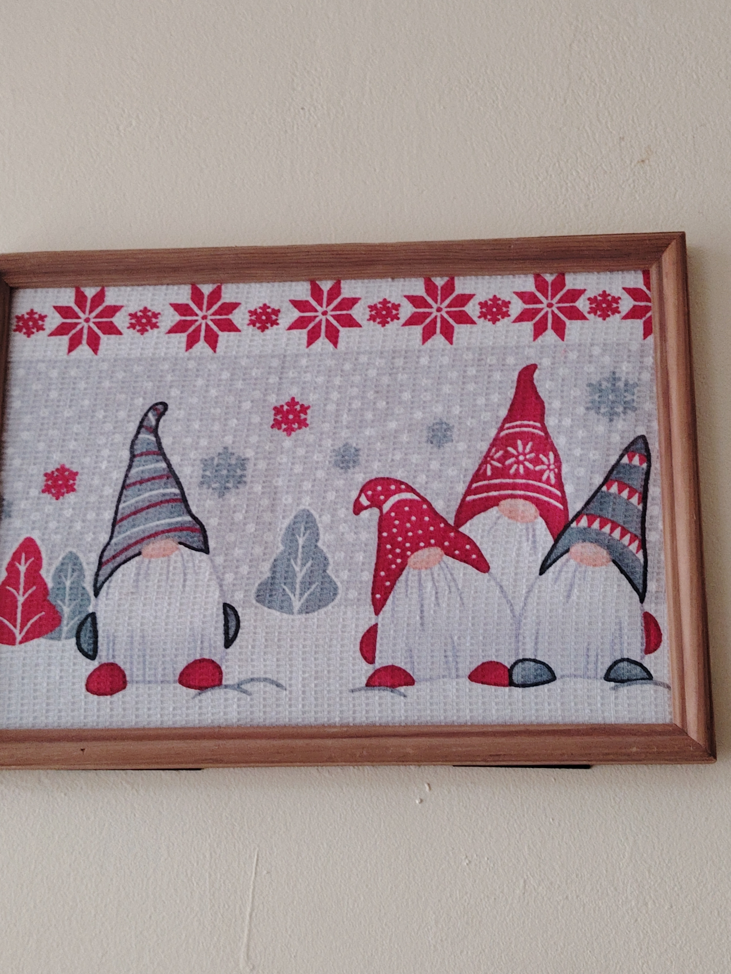 A framed piece of artwork hangs on a cream-colored wall. The artwork depicts three gnomes with tall, patterned hats and red noses. The hats are red and gray with snowflake and stripe patterns. Snowfla…read more