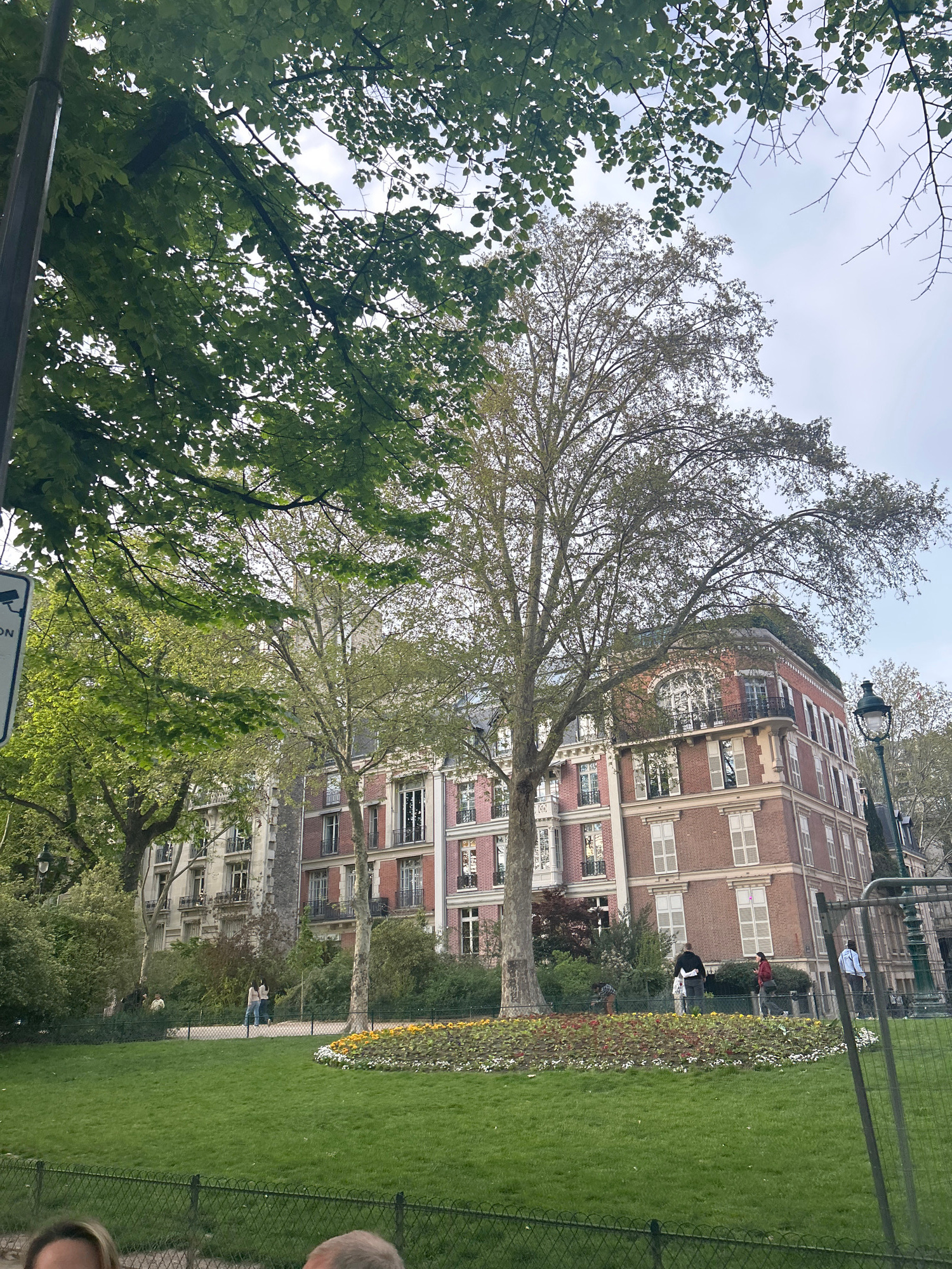 The image shows a view of a Parisian park with a building in the background. The building is a red brick structure with white-framed windows. In the foreground are trees with green foliage and a well-…read more