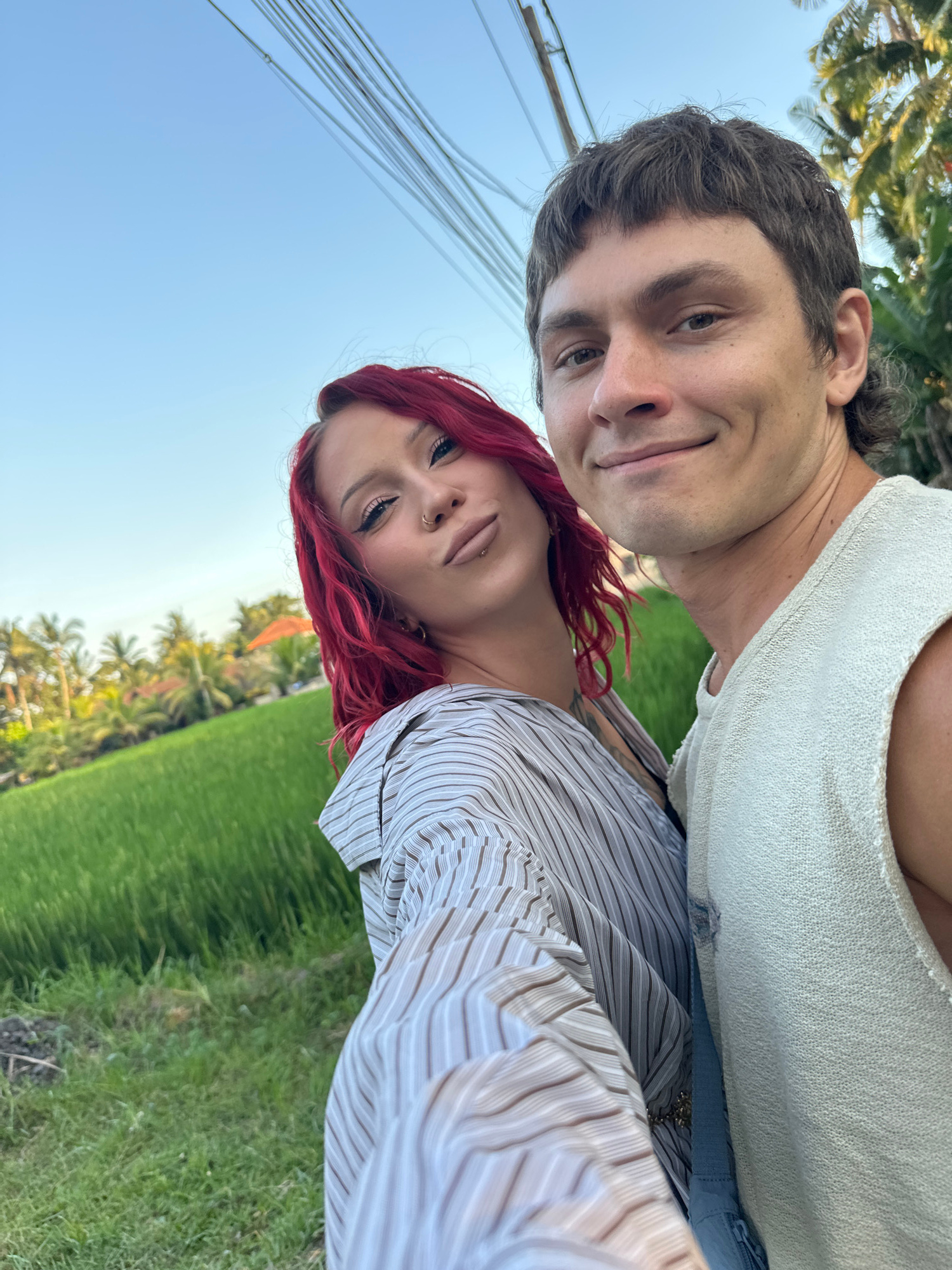 An outdoor selfie features two individuals, a man and a woman, positioned vertically in a close-up shot against a natural backdrop. The image is rotated, making it appear as if they are lying down loo…read more