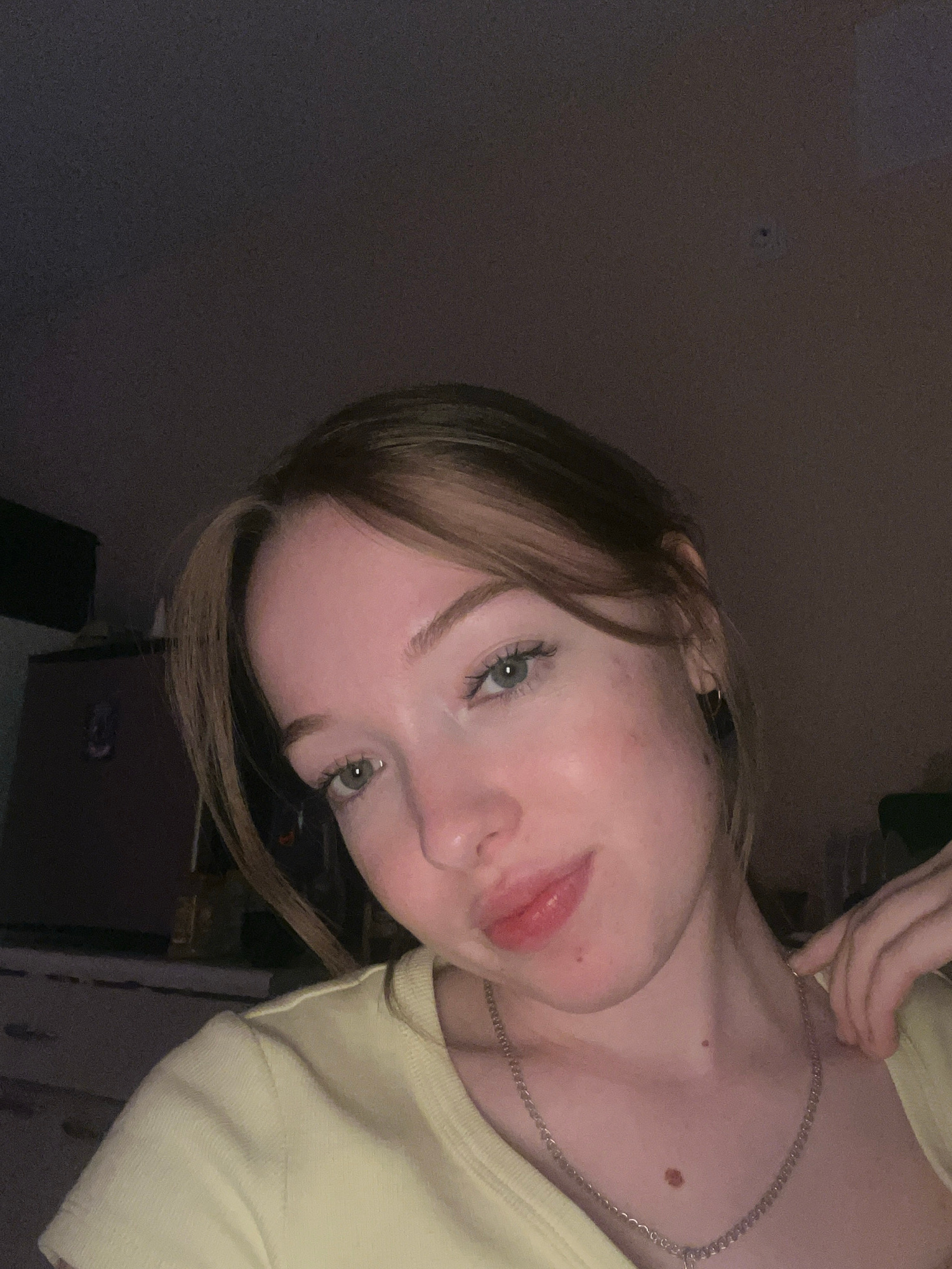 A young woman with light skin, fair hair with brown highlights, and green eyes is looking at the camera. She is wearing a light yellow top and a silver necklace. The background is dark and indistinct,…read more